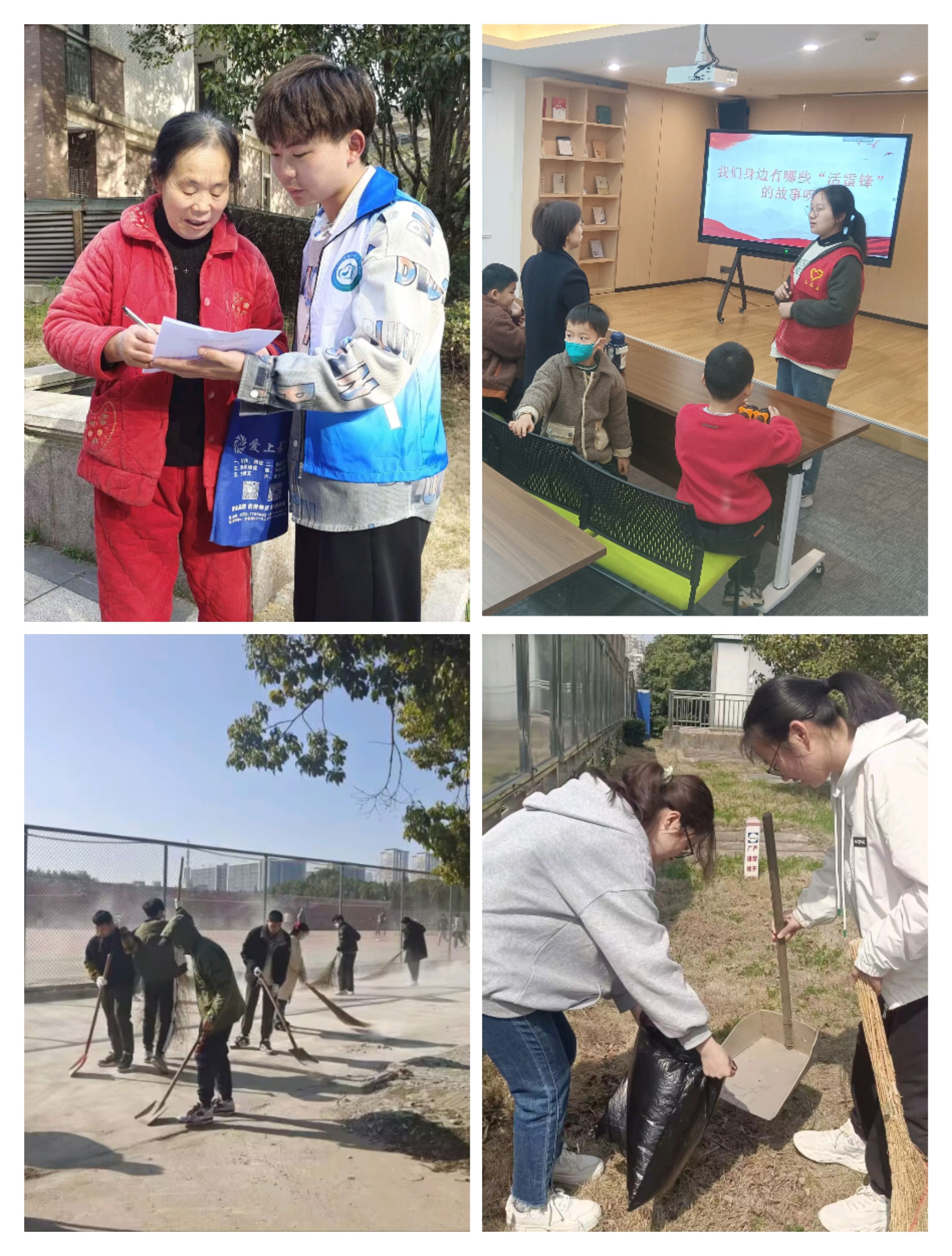 以学雷锋纪念日为契机,常态化参与学雷锋志愿服务活动让学雷锋活动融入日常、化作经常,把学雷锋志愿服务做到你我身边,将雷锋精神内化为精神养料,做雷锋精神的践行者。一次校园清洁。大学生就业促进与互助协会组织志愿者开展美化校园环境的志愿活动,规范自行车、电动车摆放,整理桌椅,清扫楼道。参与劳动教育的学生立足岗位,从食堂服务到校园清洁,从门卫安保到绿化栽培,用心用情营造良好校园环境服务师生。一次社区帮扶。环境保护协会深入柏庄社区,积极调研社区环境状况,以垃圾分类为主题,制作科普宣传册,向社区居民志愿科普,讲解垃圾分类细则,助力垃圾分类实施。一场志愿宣讲。学生会成员前往马饮书房协助进行书籍整理,面向亲子读者开展“学雷锋,树新风”主题教育宣讲活动,从雷锋印象、精神内涵、重要论述、当代榜样等方面讲解雷锋故事,感悟雷锋精神。