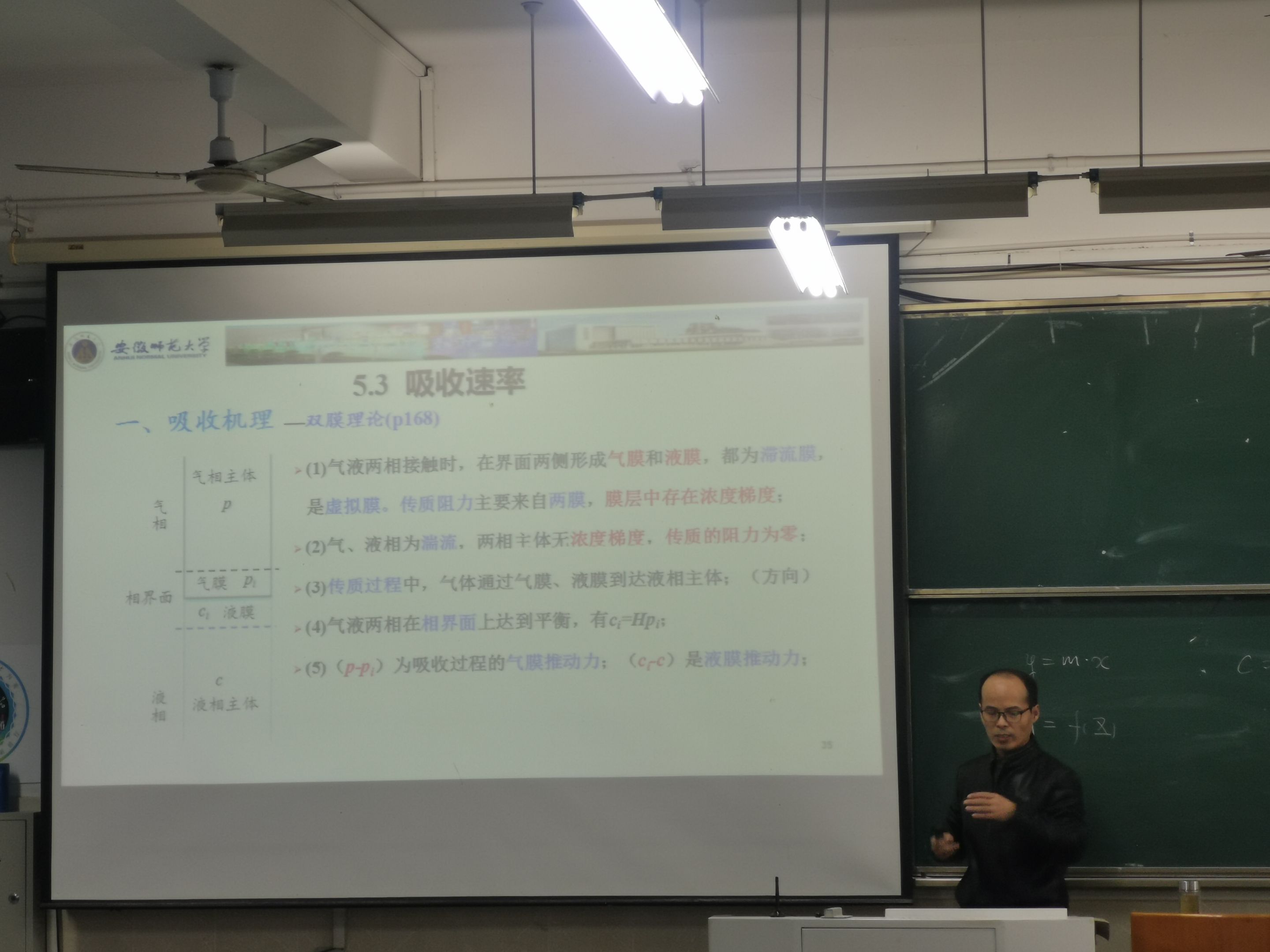 课堂伊始,许老师首先以化学工程基础原理吸收相平衡中的亨利定律题目为开题,引出这次课堂的主要内容——双膜理论以及分子扩散定律。许发功老师由浅及深,层层递进的向同学们讲解了双膜理论的五点基本论点,通过PPT图片以及例题解答进一步巩固的双膜理论的基础理论点。