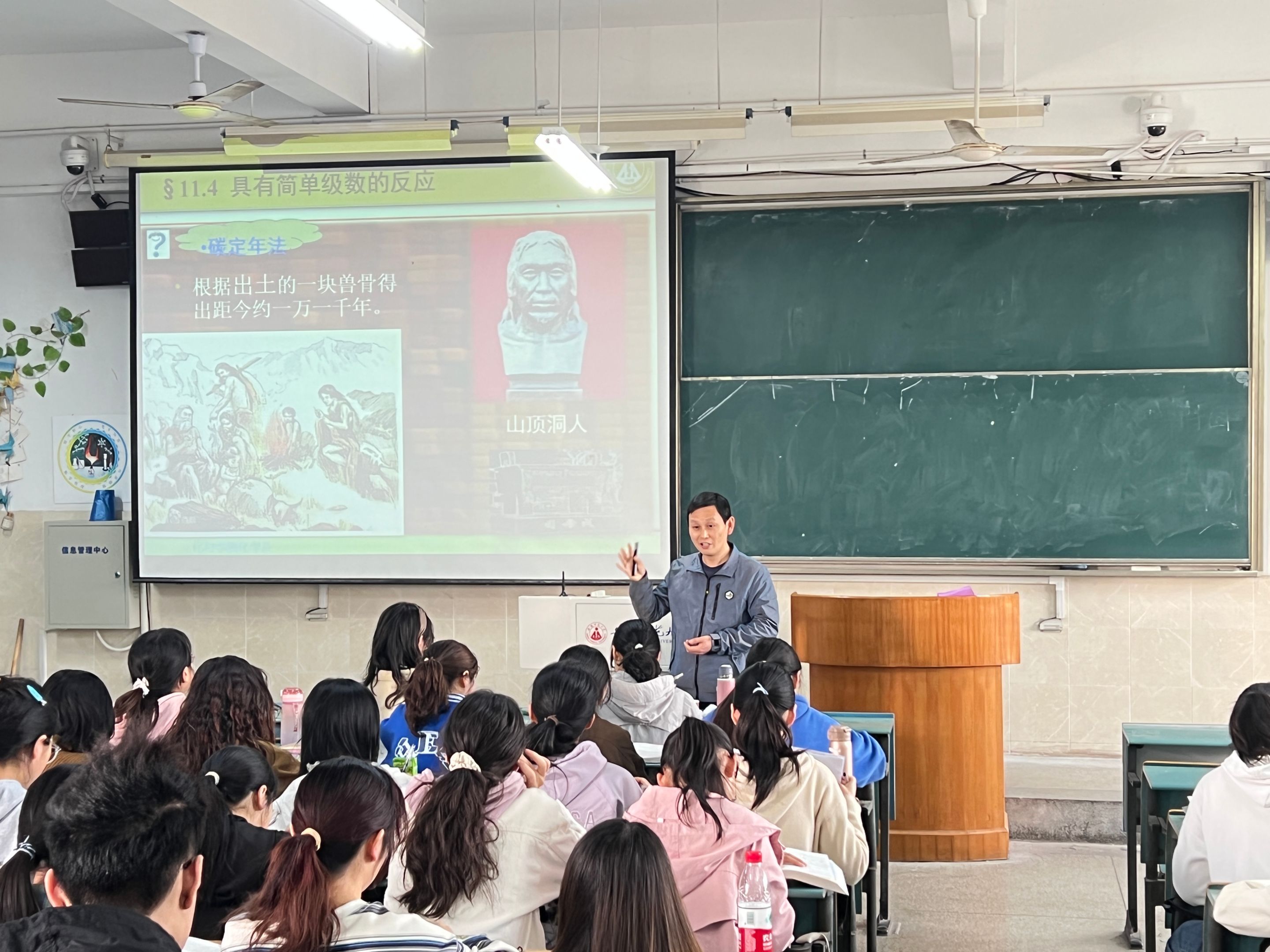 本节课的授课内容为“具有简单级数的反应”。陈华茂老师首先通过例题以及提问的方式带领学生们回顾了上节课的内容。随后,陈老师通过讲述碳定年法的故事导入本节课内容,他先从一级反应的三个特点入手,并通过例题将一级反应与碳定年法联系起来,这样的教学方式巧妙地将化学原理融入生活实践,让学生们直观地感受化学的魅力。