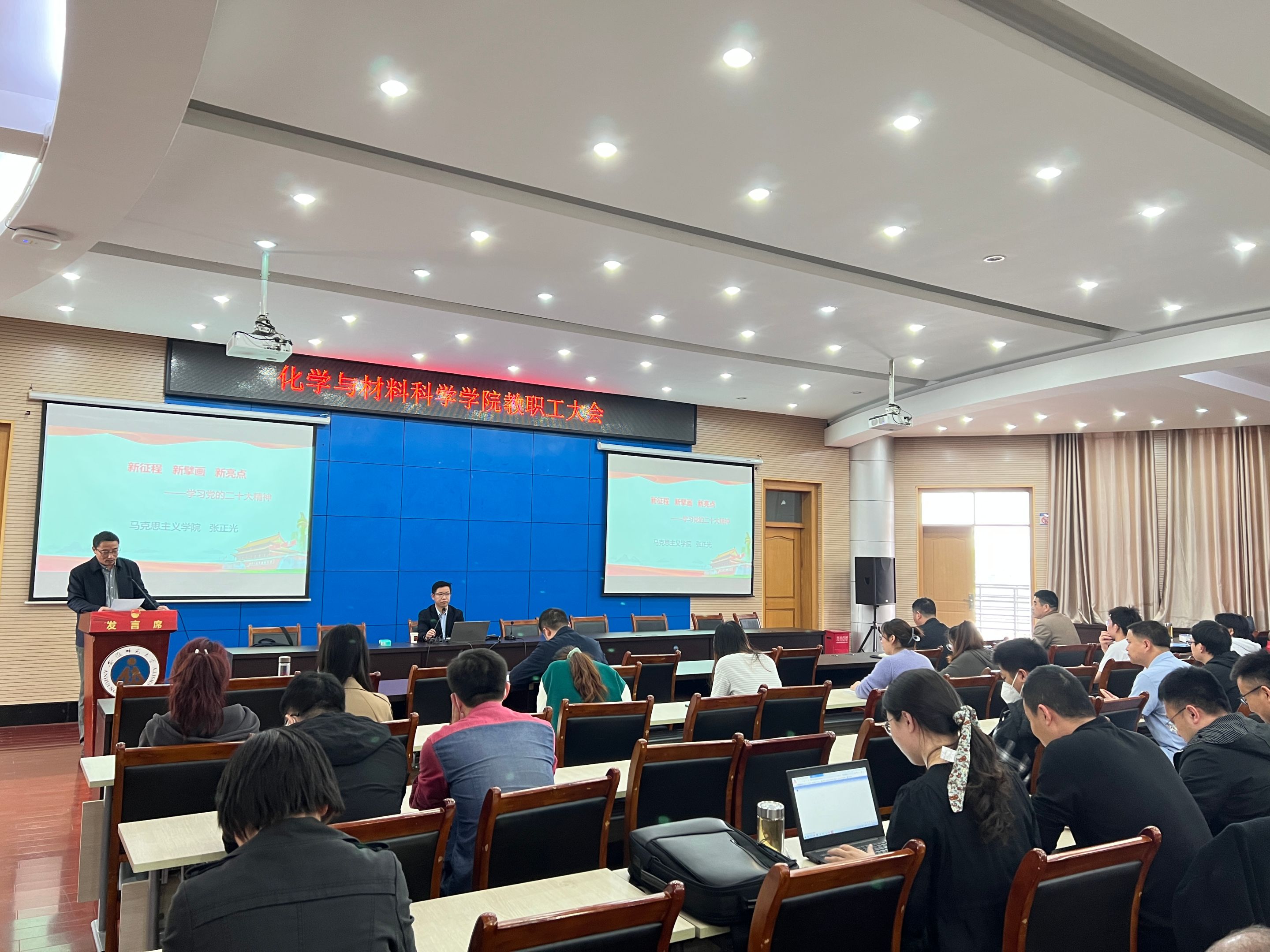 张正光作题为《新征程新擘画新亮点——学习党的二十大精神》的专题报告。他从党的二十大报告的历史背景、篇章结构、十大亮点、学习体会等几个方面进行细致解读。他认为,大会的主题回答了举什么旗帜、走什么路、以什么样的精神状态、实现什么样的目标四个问题,详细分析了报告的十大亮点。他指出,学习党的二十大报告要认真读原文,逐字逐句地读、版本对照着读;要深刻悟原理,领悟新思想、新论断、新观点、新要求;要带着问题读,围绕思想问题、工作问题和生活问题;要结合实际读,推动理论与实践相互结合;要引领方向读,坚定信仰、信念、信心。