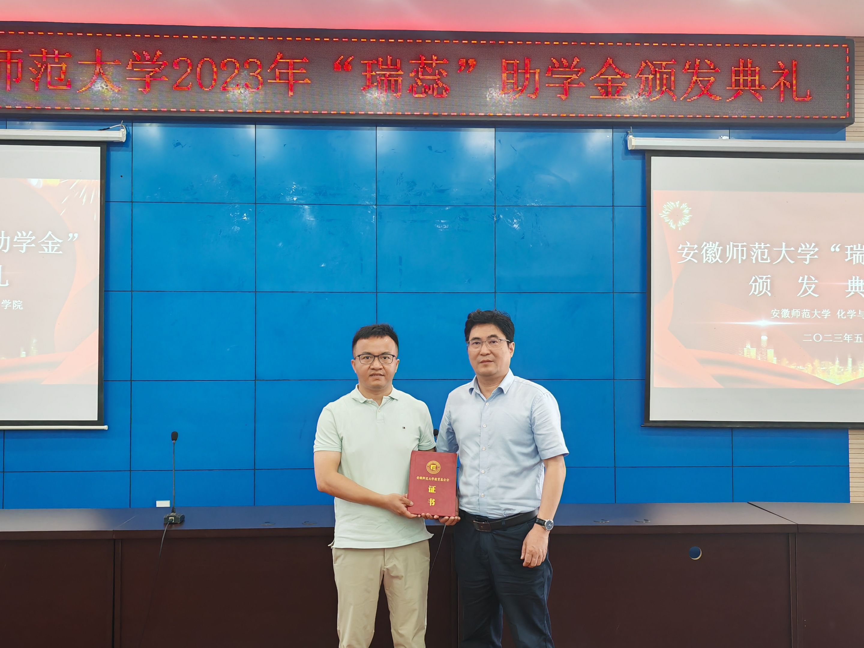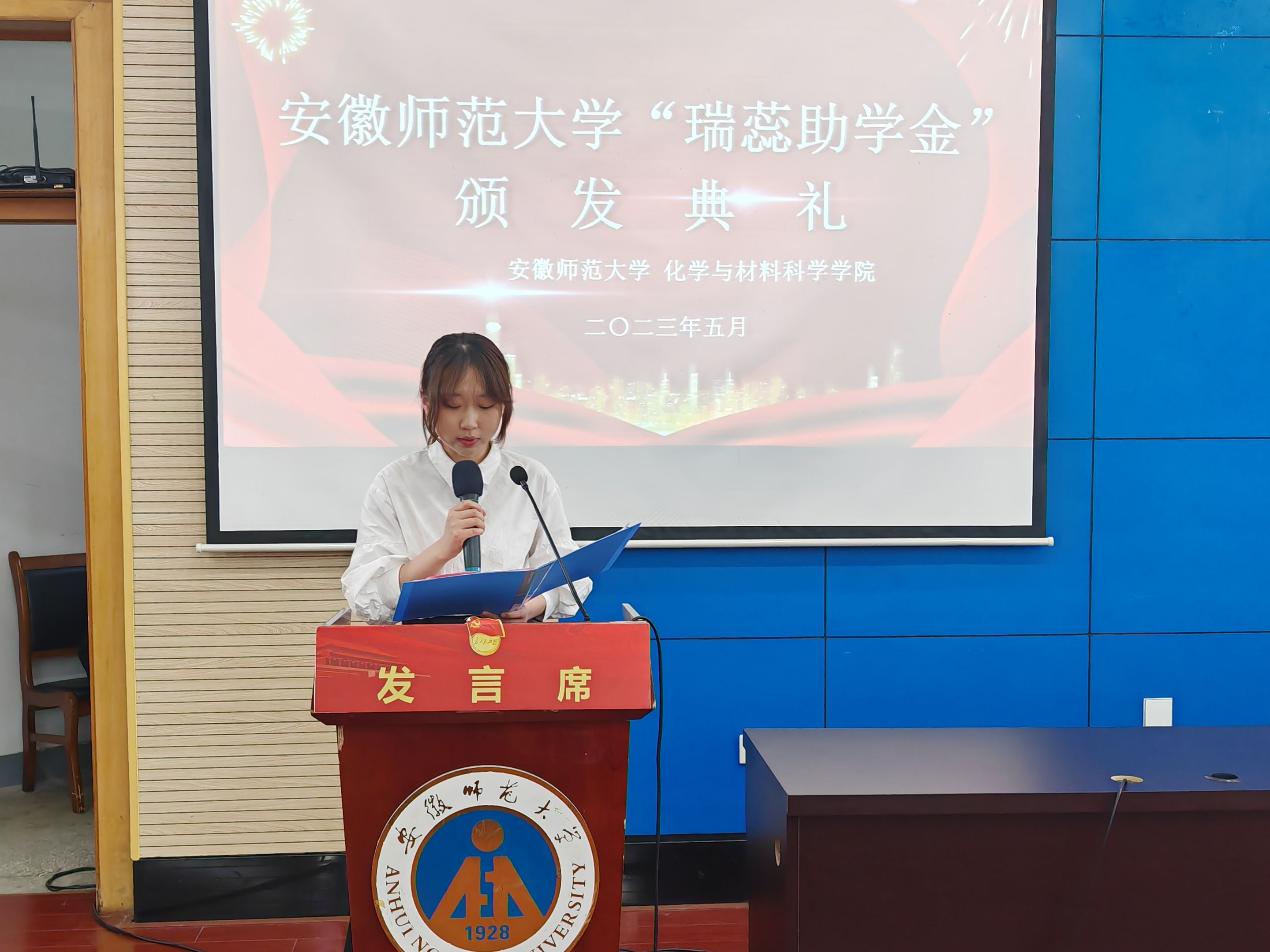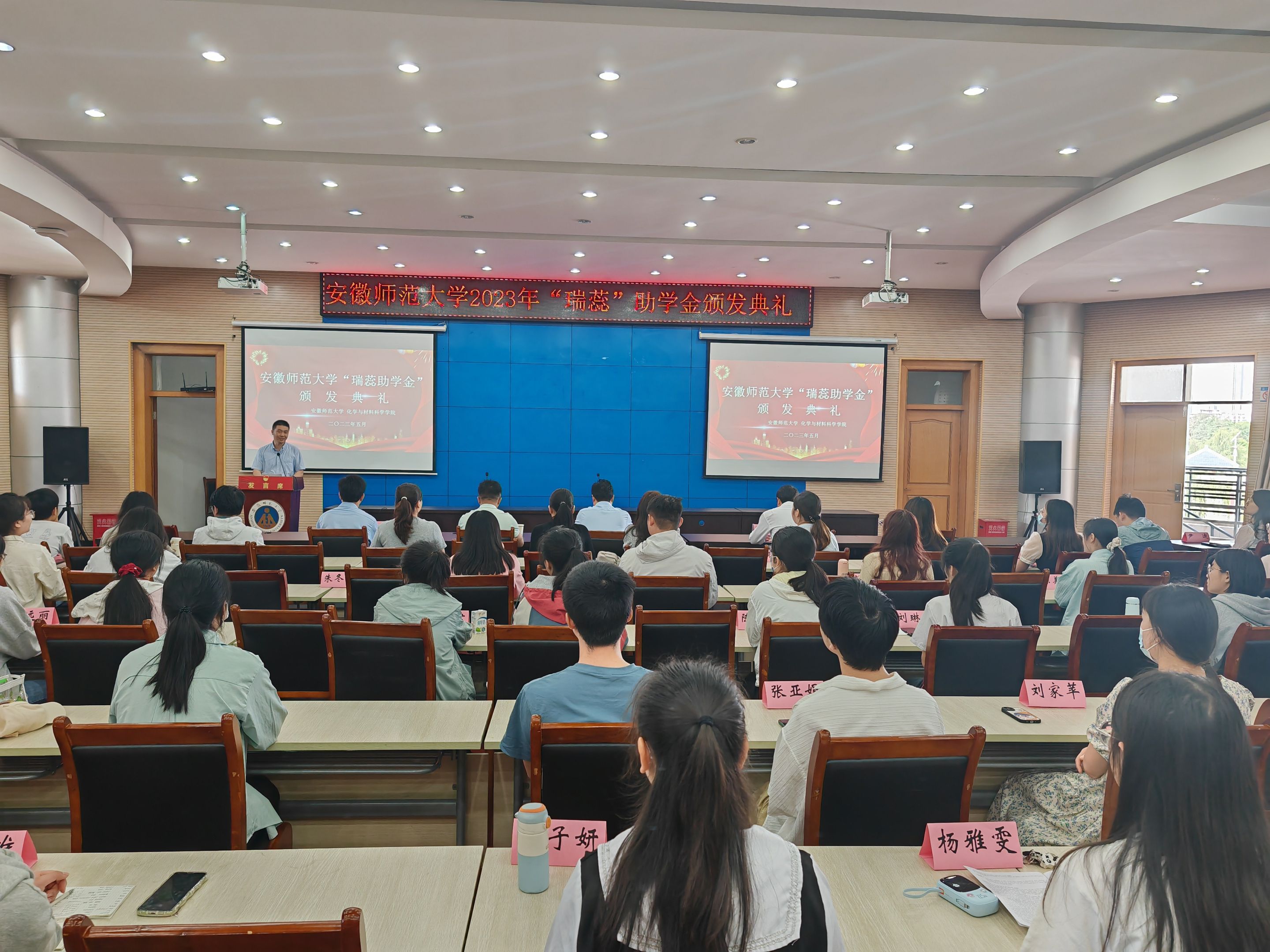 颁发典礼在庄严的国歌中拉开序幕。与会嘉宾分2组共8个批次向100名研究生和本科生颁发了助学金。