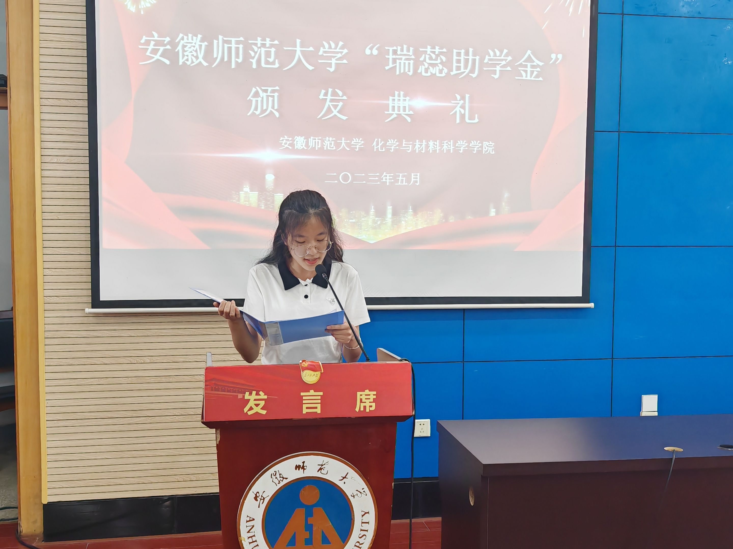 受助学生代表王亚辉和崔玲惠同学代表第一届、第二届受助学生表达了对胡浩捐资设立“瑞蕊助学金”的感激之情,她们表示助学金的设立和发放让经济困难的学子安心在校园内学习,让贫困学子感受到了学校的温暖以及校友对母校教育事业发展的关心,两位同学表示将珍惜机遇、自立自强、奋发进取,立志于回馈社会。