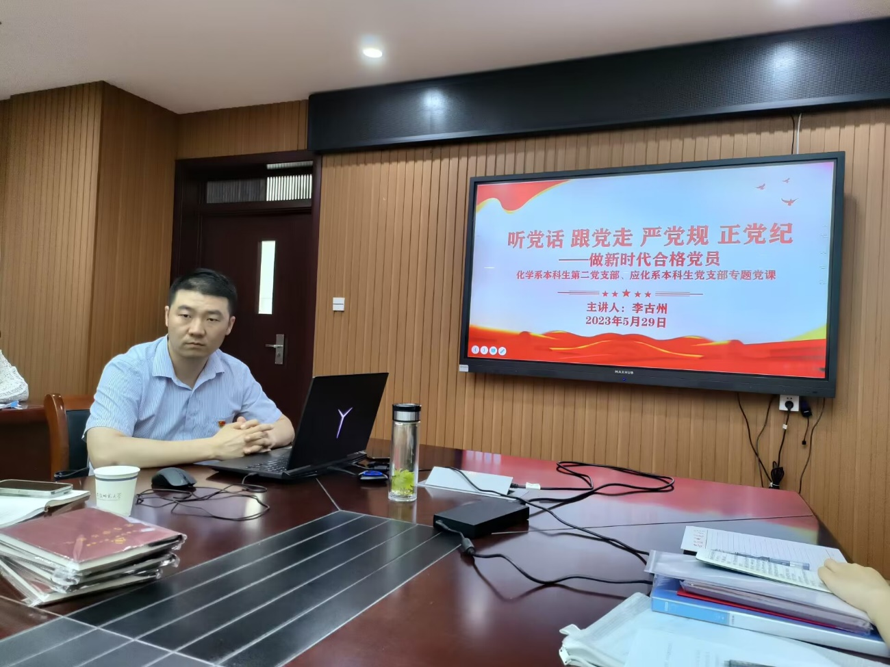 朱会凌)5月29日下午,学院党委副书记、纪委书记李古州在礼勤楼702会议室为应化系本科生党支部、化学系本科生第二党支部讲授题为“听党话、跟党走、严党规、正党纪——做新时代合格党员”的专题党课。