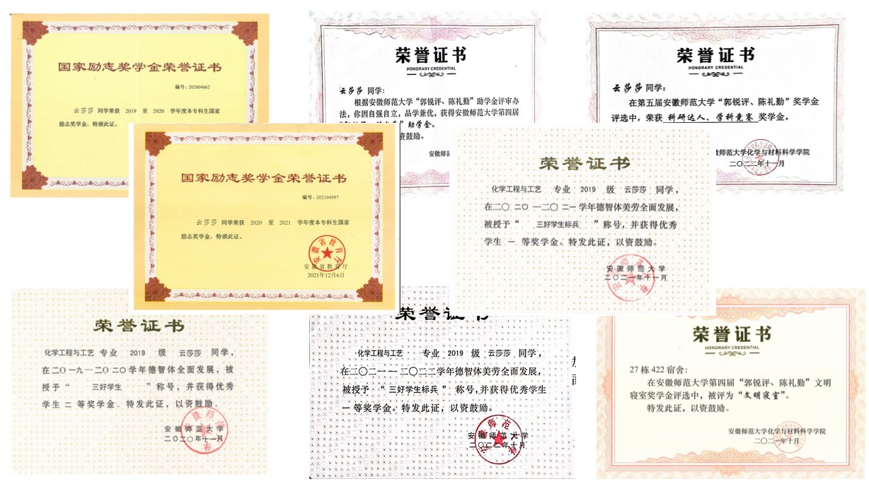 。在崭新的大学环境中,及时调整自己的心态,以积极向上的态度面对大学里的每一件事情。在校期间,她表现优异,思想端正,积极入党,成为班级第一批学生党员。不仅如此,她还担任材料化学专业本科生党支部及材料化学专业的宣传委员,做好支部与班级的宣传工作,在2021年获得校级“优秀团干”称号。做好工作的同时,她成绩优异,勤奋好学,专业成绩排名位于专业前列,连续四年获得校级一等、二等奖学金,获得“三好学生”、“三好学生标兵”称号。她顺利通过四级六级考试,普通话等级考试与教师资格证考试。现如今,已经成功推免至中国科学学技术大学材料物理与化学专业。