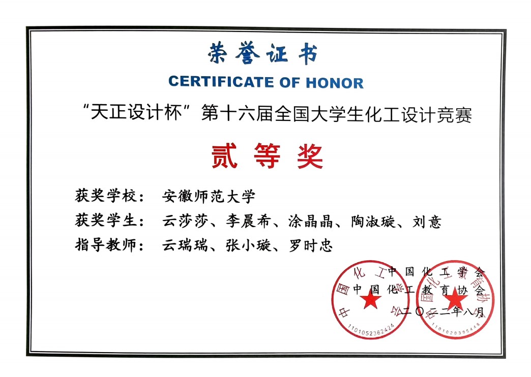 2019级化学工程与工艺专业本科生,目前已保送至重庆大学攻读化学工程与技术专业,2023年安徽省普通高等学校优秀毕业生。