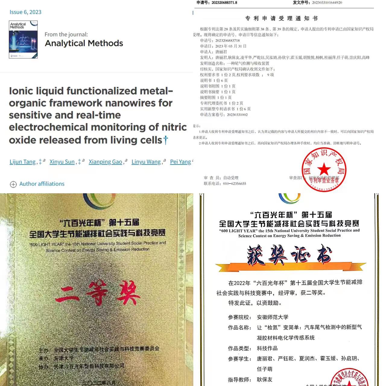 的学生,化学学科的学习并不只是理论学习,更是与实践相结合的学习。她常说“纸上得来终觉浅,绝知此事要躬行”,她凭借着坚实的理论知识和过人的专业素养,在实验室日复一日,不断探索。理论与实践的结合与碰撞,终于让她看见了成功的火苗。以赛促学强本领,科研路上炼真功。在竞赛方面,她带领团队,在第“六百光年杯”第十五届节能减排社会实践与科技竞赛中获得国家二等奖,实现了师大在此奖项上的重大突破,与此同时,她还斩获“挑战杯”大学生课外科技竞赛校级特等奖,“互联网+”大学生创新创业大赛校级二等奖等多个奖项。在科研方面,她成功申请到校级“优秀毕业论文培育计划”立项,并且经过不断的努力,以第一作者身份在SCI分区三区杂志Analytical Methods上发表论文,截至目前有一项专利已提交至国家专利局。