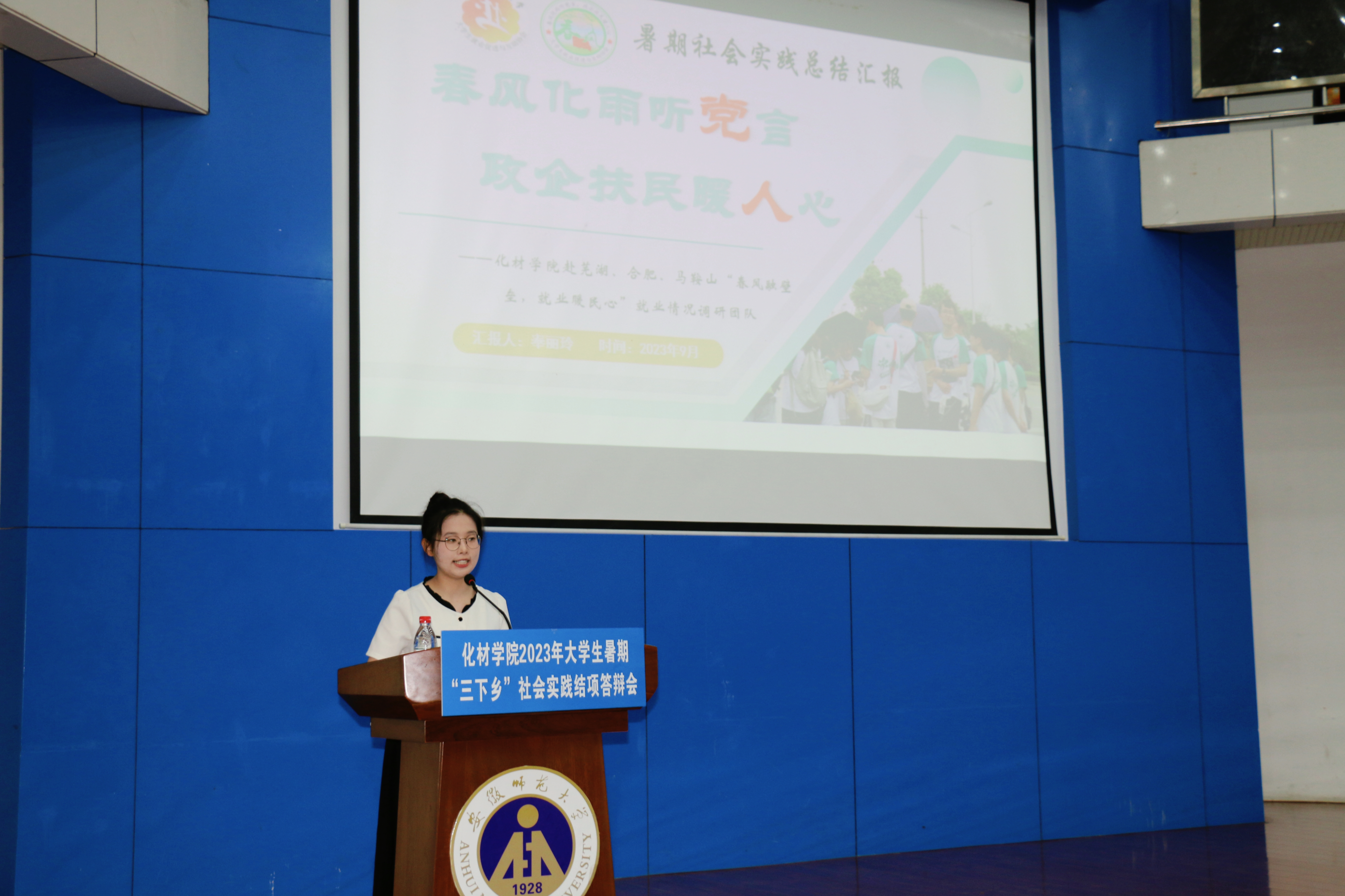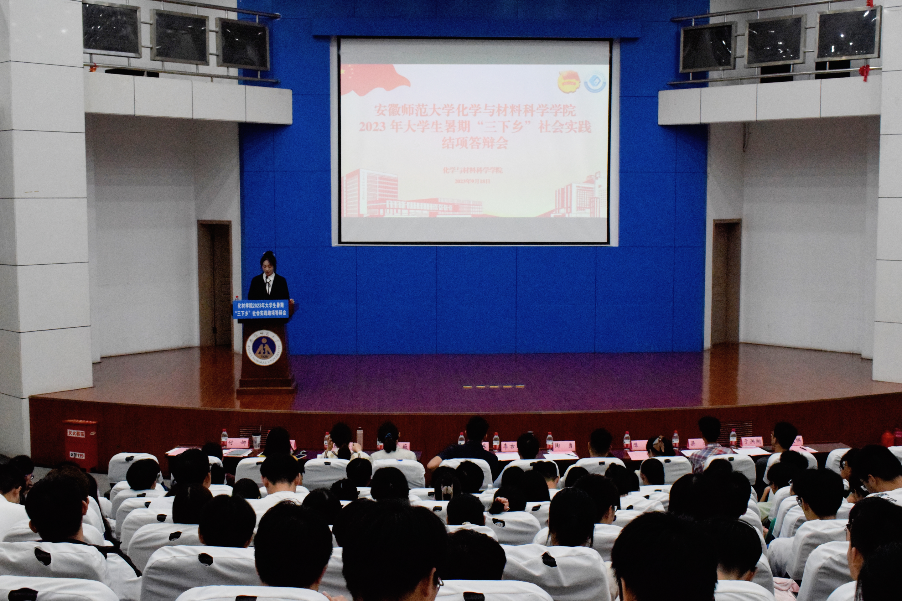 于敬文图书馆报告厅开展2023年大学生“三下乡”暑期社会实践团队总结汇报会。学院党委副书记李古州,团委书记梅冠东、团委副书记陶勇、张薇、全体专兼职辅导员,以及暑期社会实践团队和2022、2023级各班学生代表参会。汇报会由汪子欣主持。