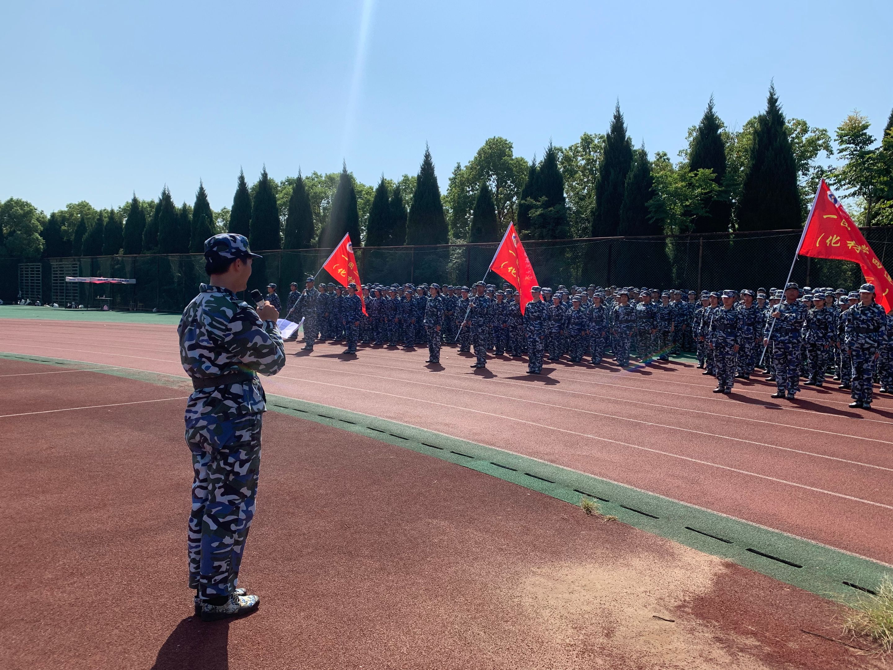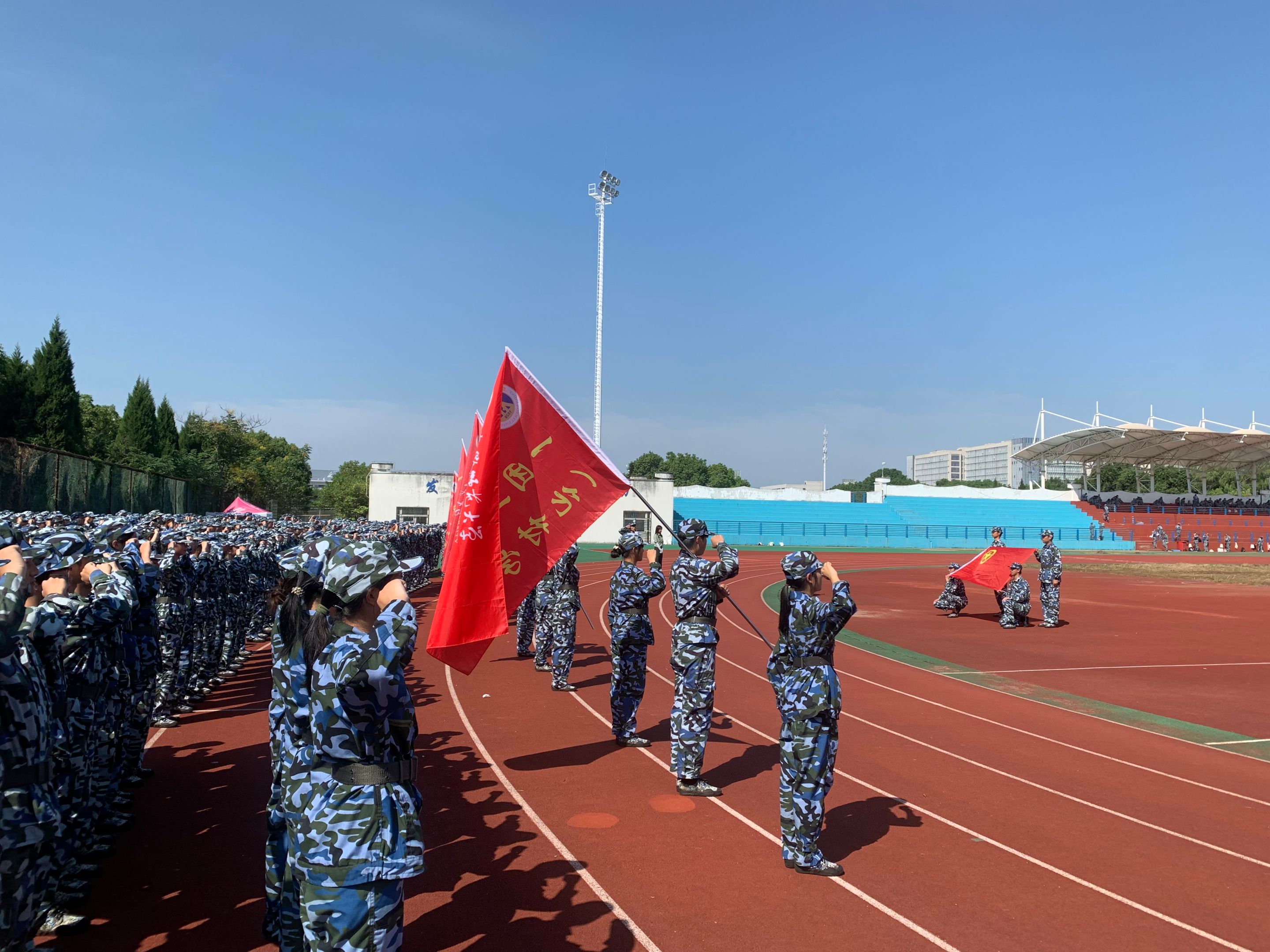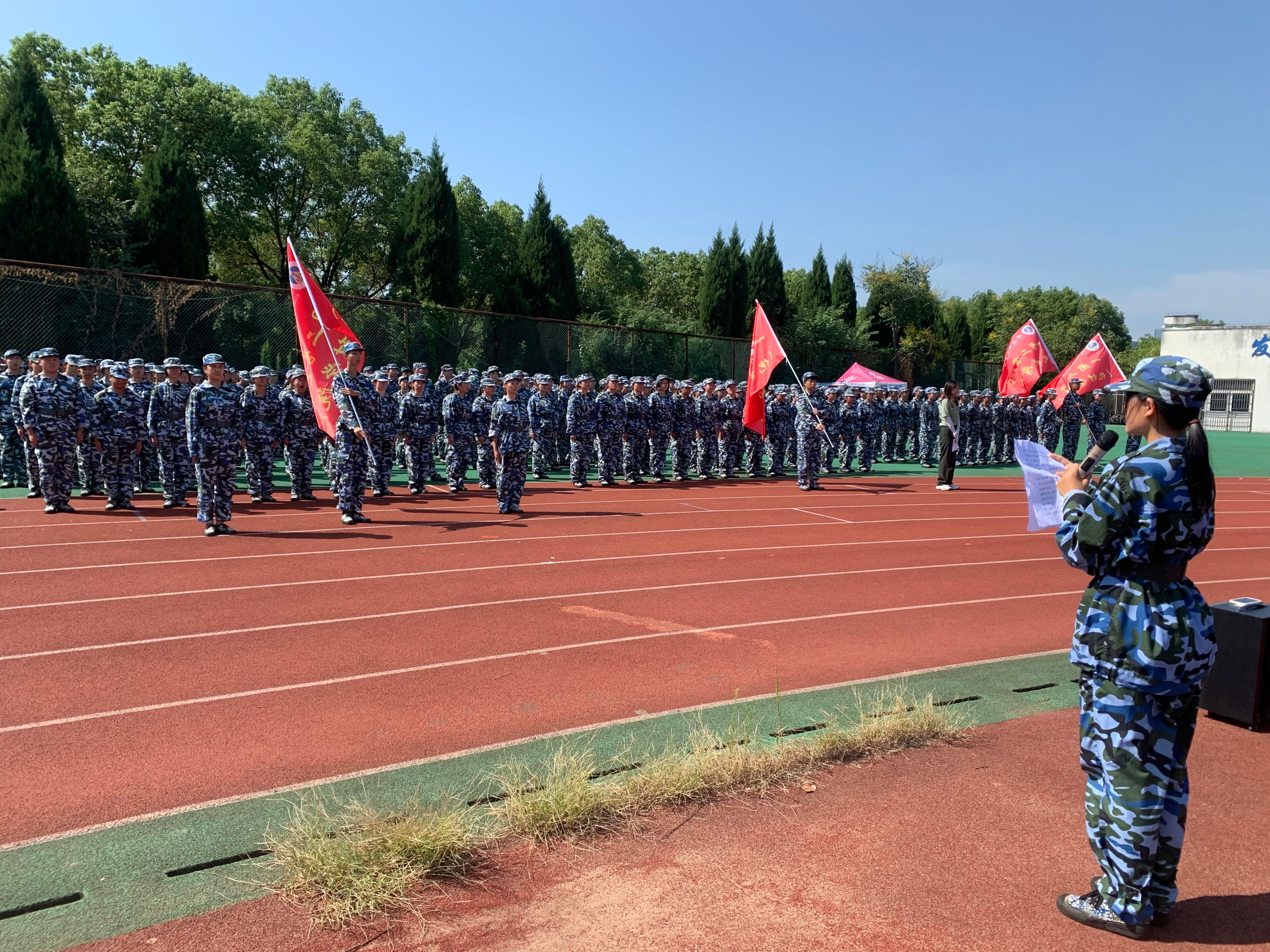 伴随防空警报声响起,全体人员默哀三分钟,表达对先烈缅怀之情。默哀结束后,全体新生在团旗前高举右拳,在团员孟坤伦的领誓下,面对庄严高举的团旗重温入团誓词。