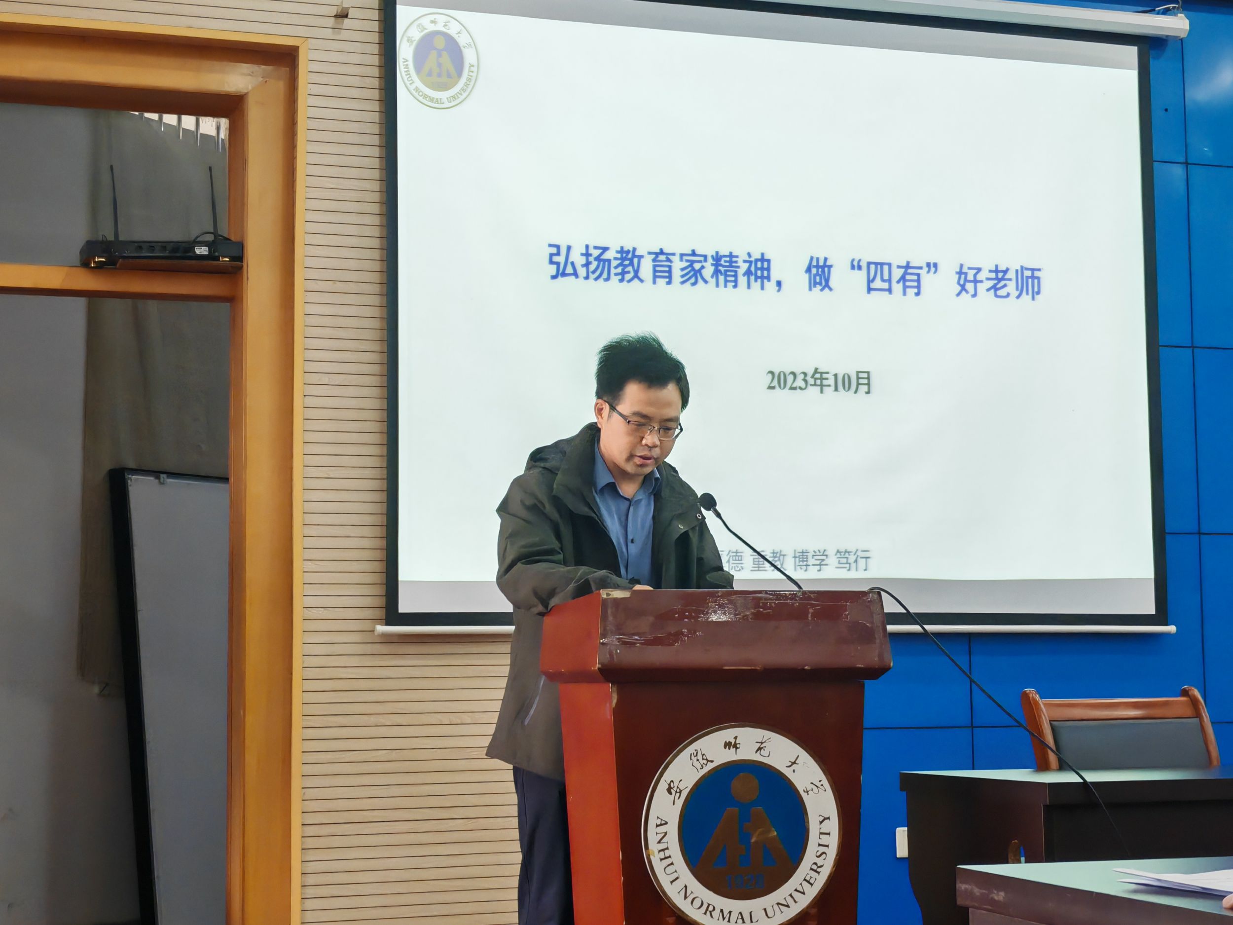方臻结合个人体会作了题为《弘扬教育家精神,做“四有”好老师》的报告,他从理想信念、道德情操、育人智慧、躬耕态度、仁爱之心、弘道追求6个方面对学院教师提出要求,希望学院教师可以拥有宽广的国际视野和多元背景,及时更新知识库,紧跟学科前沿,更新教学内容和教学方法,争做“四有”好老师。