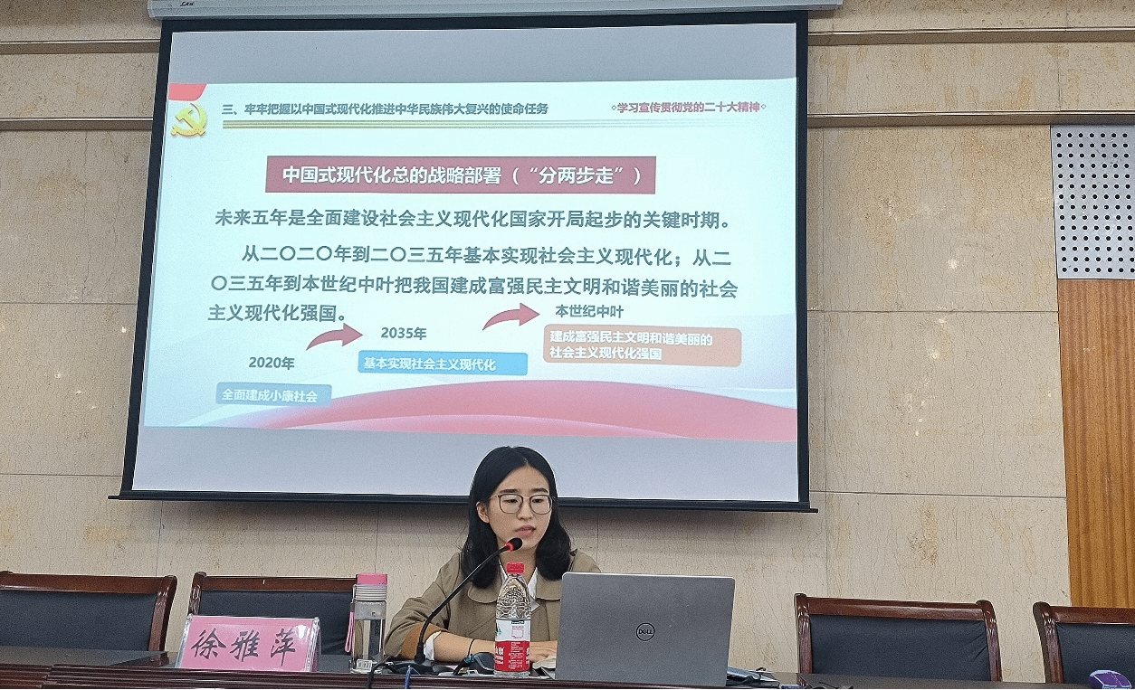 自强不息,开创新局。党委组织部(机关党委)机关事务管理科科长徐雅萍以《以党的二十大精神为指引,做可堪大任的时代好青年》讲授党的二十大精神,她围绕工作回顾、世界观和方法论、使命任务、牢牢把握以为大自我革命的重要要求这几个部分,以《觉醒年代》南陈北李相约建党的例子强调伟大建党精神的重要性,指出同学们要扣好理想信念的一粒扣子,发挥先锋模范作用,严于律己,有序参与政治生活、深入基层、投身现代化建设、奋力走在创新创优的前列,争当做可堪大任的新时代好青年。