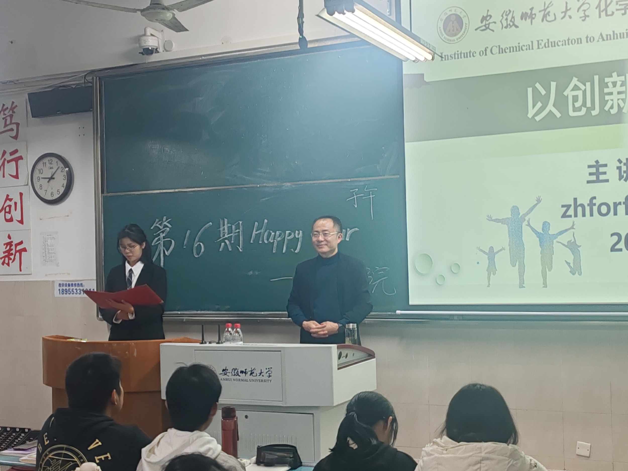 学生会生活权益部在行知楼二号楼201教室举办了第十六期“Happy Hour”活动,本次活动主题为“协同共创,你我前行”,有幸邀请到了学院化学教育研究所张四方老师为学生进行科研能力培训以及学科竞赛介绍。