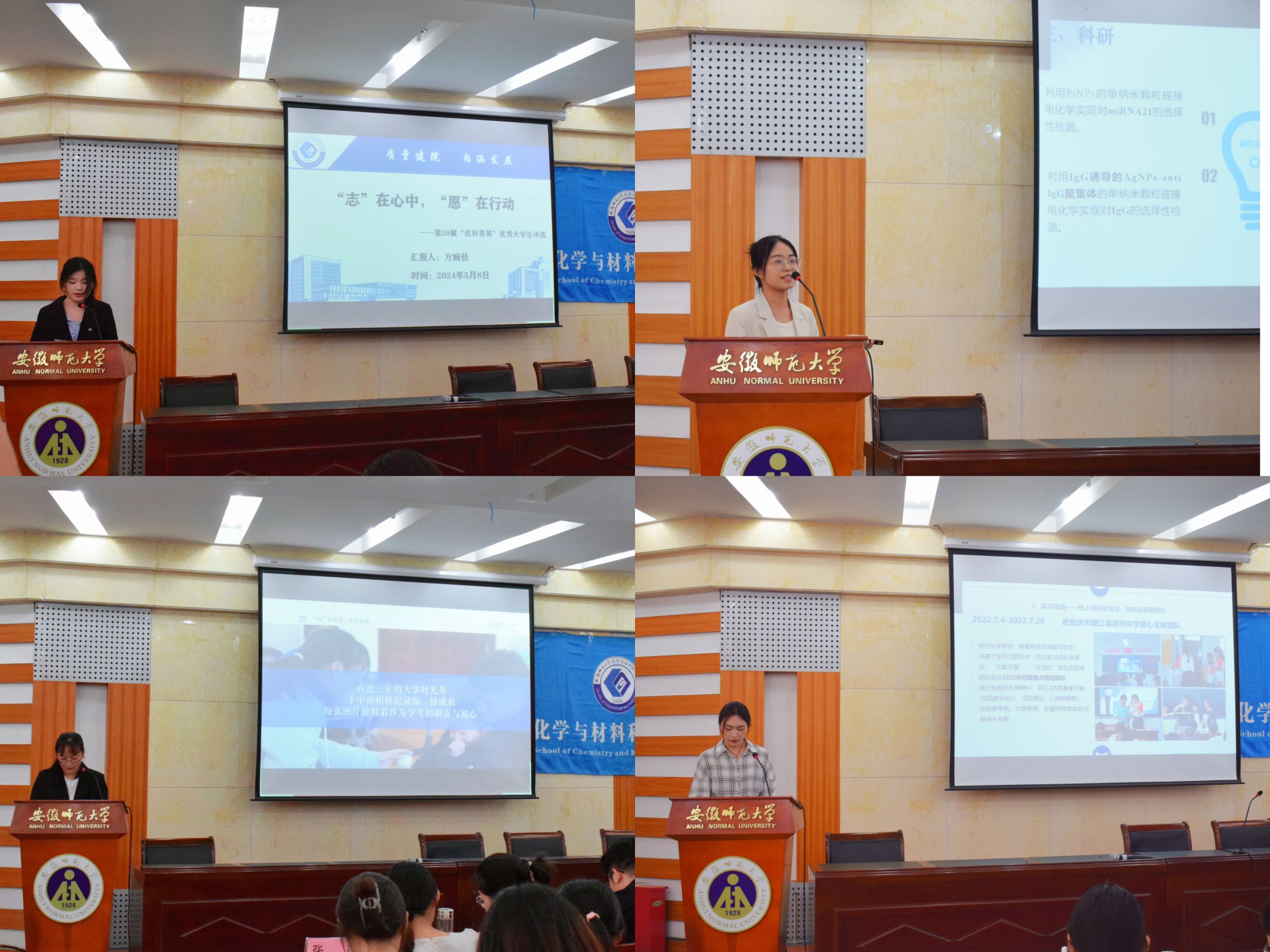 参选学生从思想情况、学习情况、学术研究、学科竞赛、社会实践、志愿服务等方面进行展示汇报,展现了化材学子优秀的精神品质。2021级化学专业博士研究生邱霞在科研路上潜心研究,以第一作者发表SCI论文五篇,主持安徽省科研项目两项,她将自己的热爱倾注校园,曾兼职研究生辅导员一职;2020级化学师范专业李昱璇勤学上进,学业成绩和综合测评均排名专业第一,荣获多项奖学金,现已保送至北京师范大学,学业之外,还注重提高自身的综合素质,发展兴趣爱好,德智体美劳全面发展;2021级化学师范专业陈子祥用砥砺行动奉献自我,累计志愿时长近1000小时,担任暑假小学期班长带领团队获得校级一等奖等荣誉,作为学生代表参加C-Green探路者青年共创营,聚焦绿色发展,为师大宣传,为社会宣传。