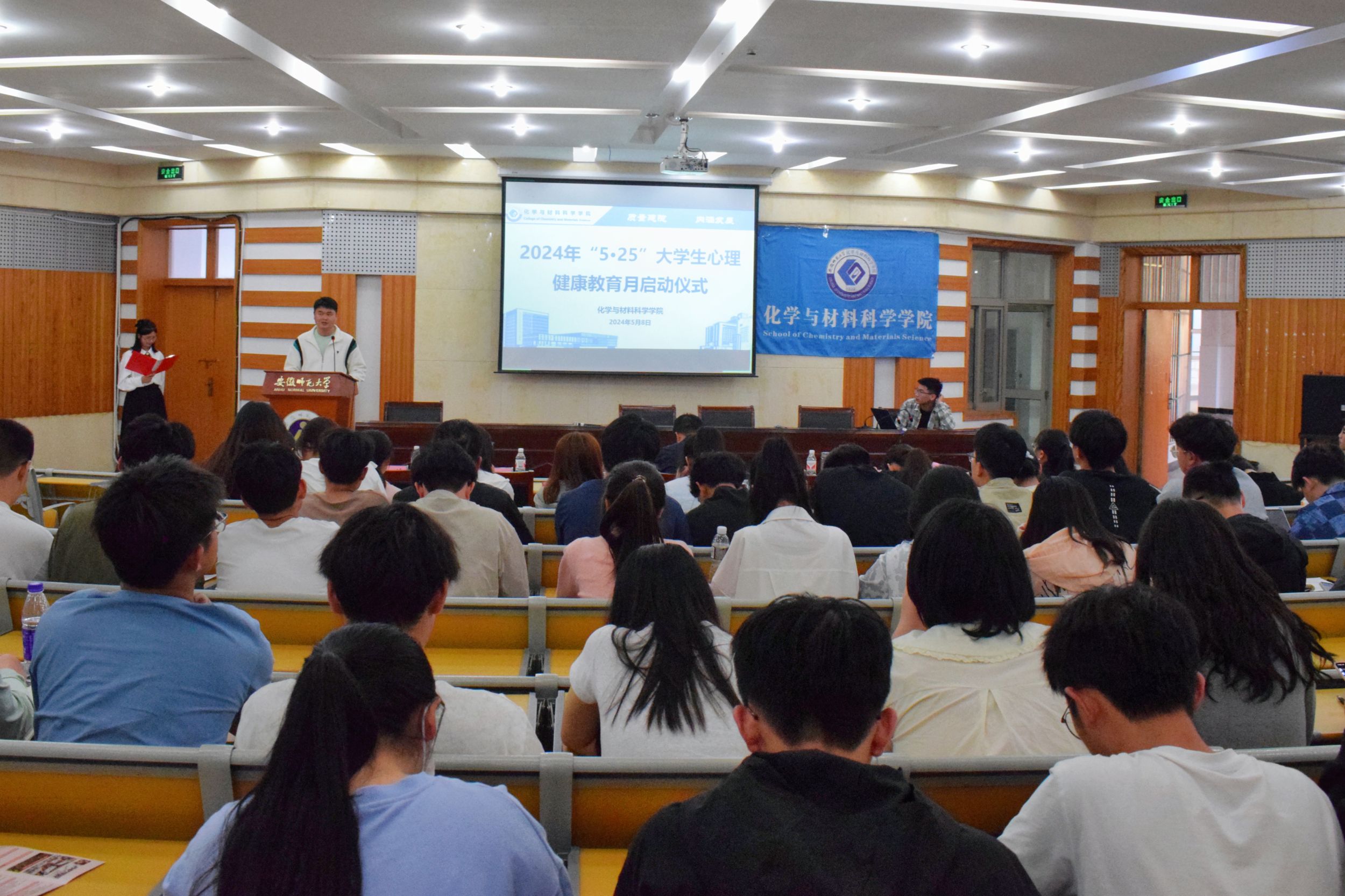 在学苑楼8号楼副楼二楼会议厅举办第二十届“化材菁英”优秀大学生评选汇报会。学院党委副书记李古州、团委书记梅冠东、全体专兼职辅导员、汇报人员和各班级学生代表参加此次大会,会议由2023级化学师范专业汪梦雅同学主持。