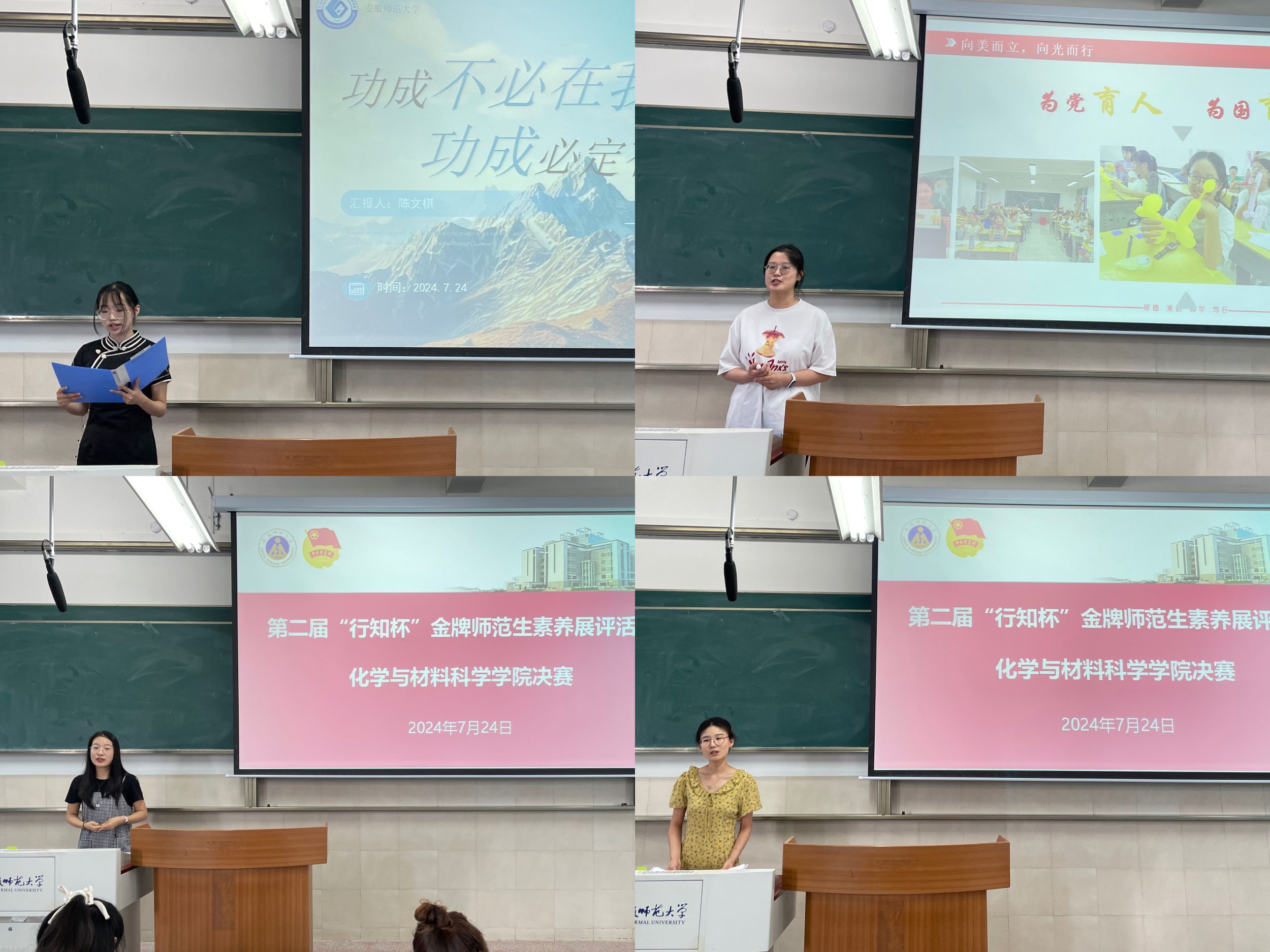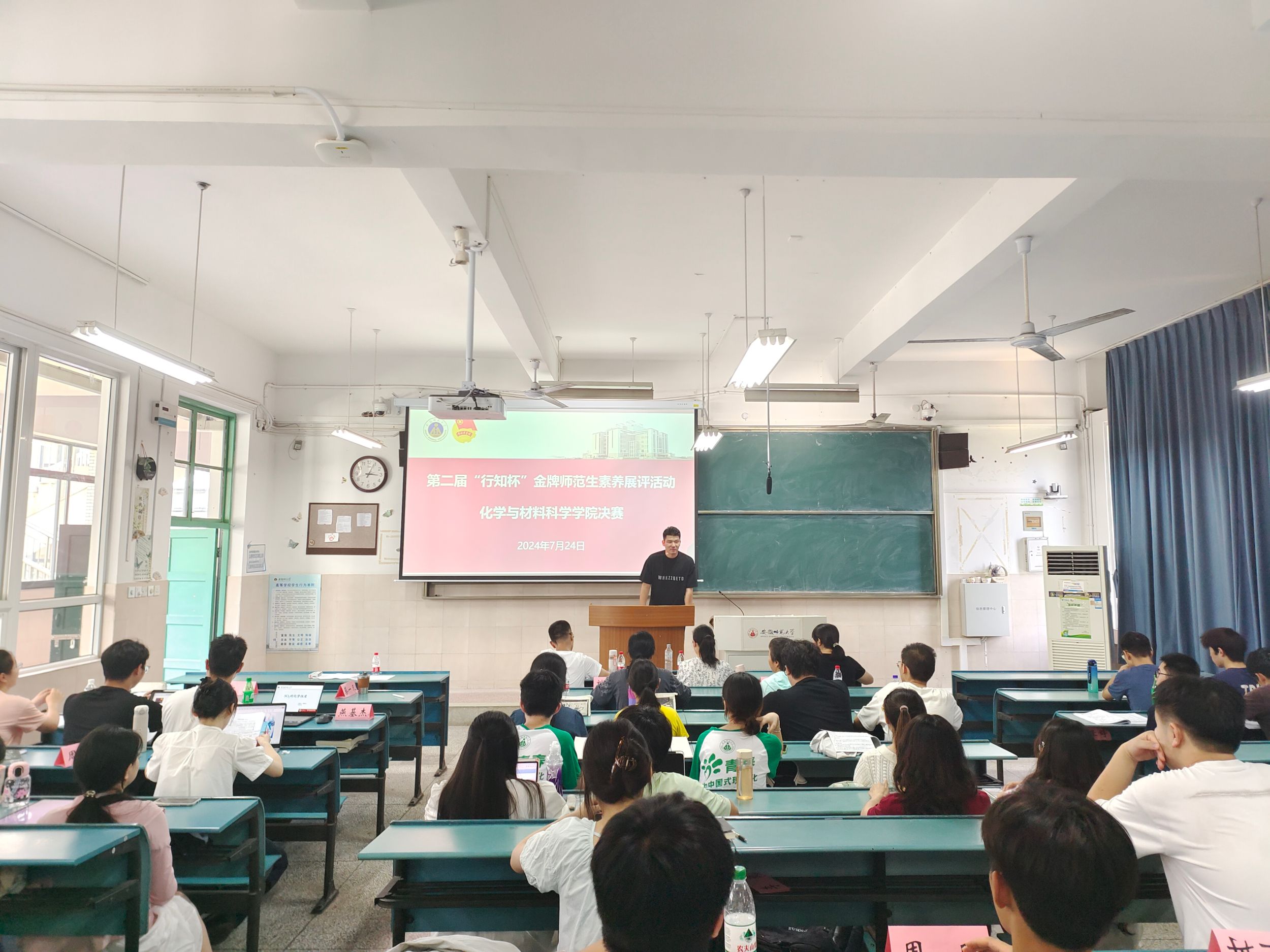 在行知楼5号楼302、303教室举办第二届“行知杯”金牌师范生素养展评活动院级决赛。学院专业课教师分别担任模拟授课、教学板书、教学教案、主题演讲比赛评委。活动由学院团委书记梅冠东主持。