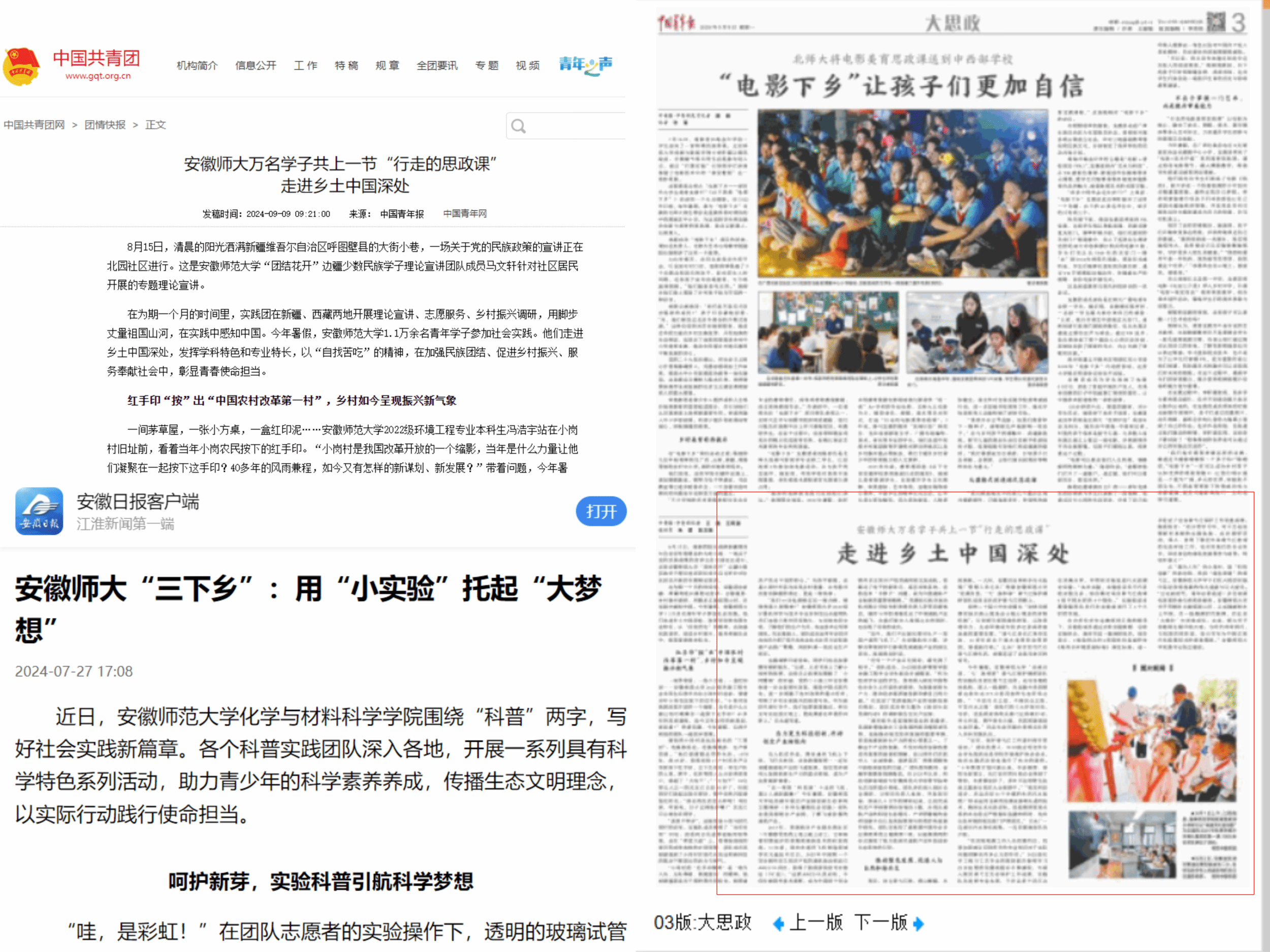 高度重视大学生“三下乡”暑期社会实践工作,今年共有25支队伍647人参与社会实践,其中3支国家级重点团队,12支校级重点项目。据统计,媒体宣传总计369篇,国家级媒体宣传文章达18篇,省级媒体宣传文章24篇,市级媒体宣传27篇,通过社会实践展现了化材青年学子积极向上的精神风貌与强烈的社会责任感,推动广大学生在实践中锻炼自我、提升能力。