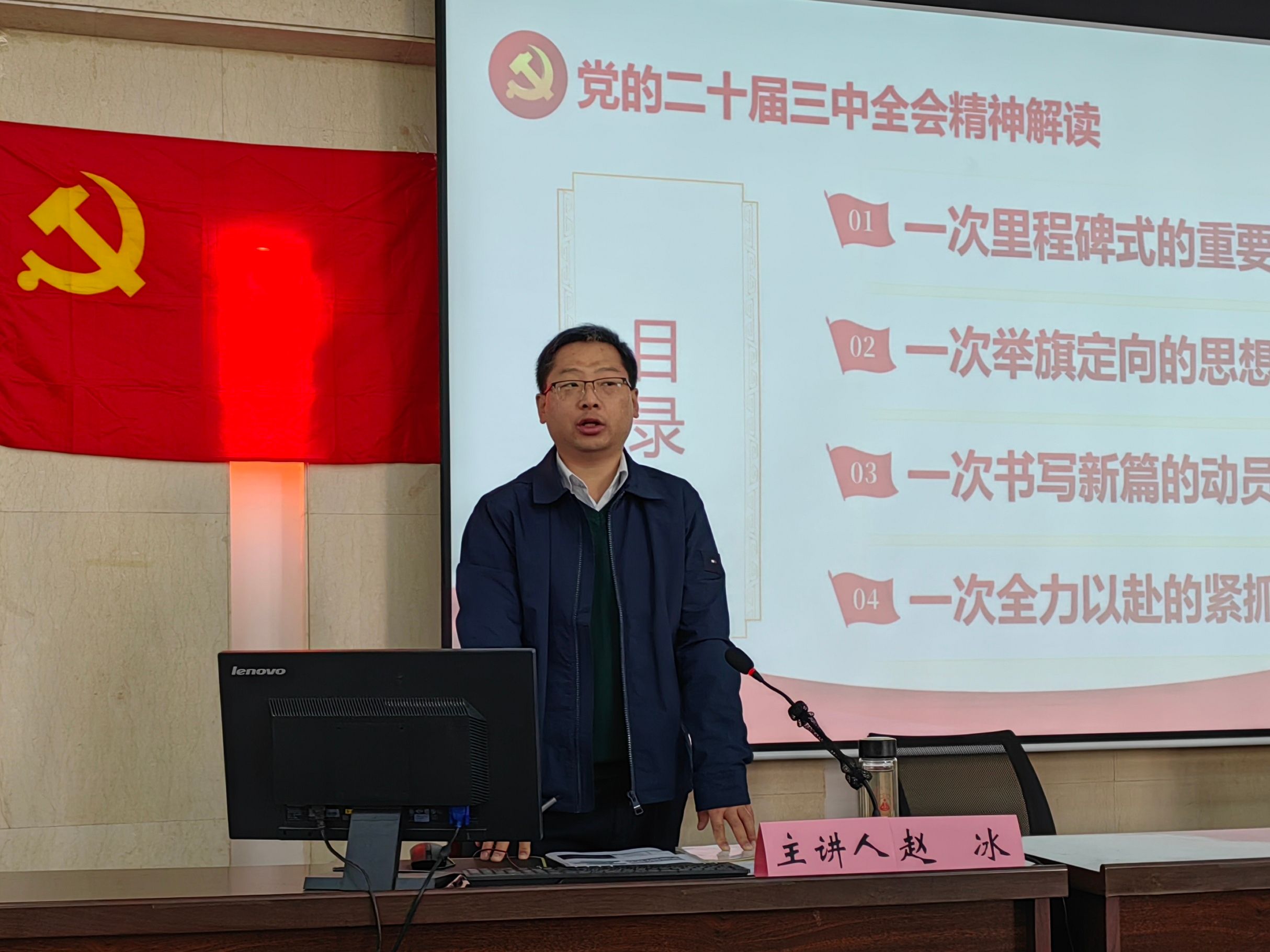 马克思主义学院副院长赵冰以《党的二十届三中全会精神解读》为主题,从“一次里程碑式的重要会议、一次举旗定向的思想指引、一次书写新篇的动员部署、一次全力以赴的紧抓落实”四个方面进行讲授,他强调,全体学生党员要准确把握党的二十届三中全会在中国现代化进程中的历史方位,深刻领会全会的重大意义,从“向哪里改、怎么改、改什么”深入理解全面深化改革的主题,认清自身现阶段的主要任务,聚焦身边小事,切实走好脚下的路,用实际行动推动党的事业高质量发展。