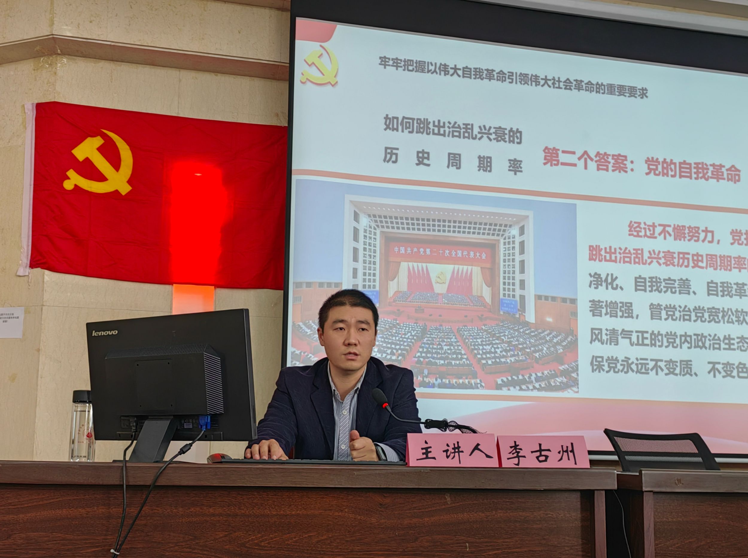 李古州以《学习党内法规、严守党规党纪——做新时代合格党员》为主题,全面梳理了党内法规建设的历程脉络,重点介绍了党的十八大以来党内法规的框架体系和制度体系,深入剖析了《中国共产党廉洁自律准则》《中国共产党纪律处分条例》《关于新形势下党内政治生活的若干准则》这三部重要法规,讲解了党内政治生活的突出问题,同时从增强政治意识、严格工作秩序、自觉接受监督三个方面,嘱托全体学生党员要不忘初心、牢记使命、严守党纪。