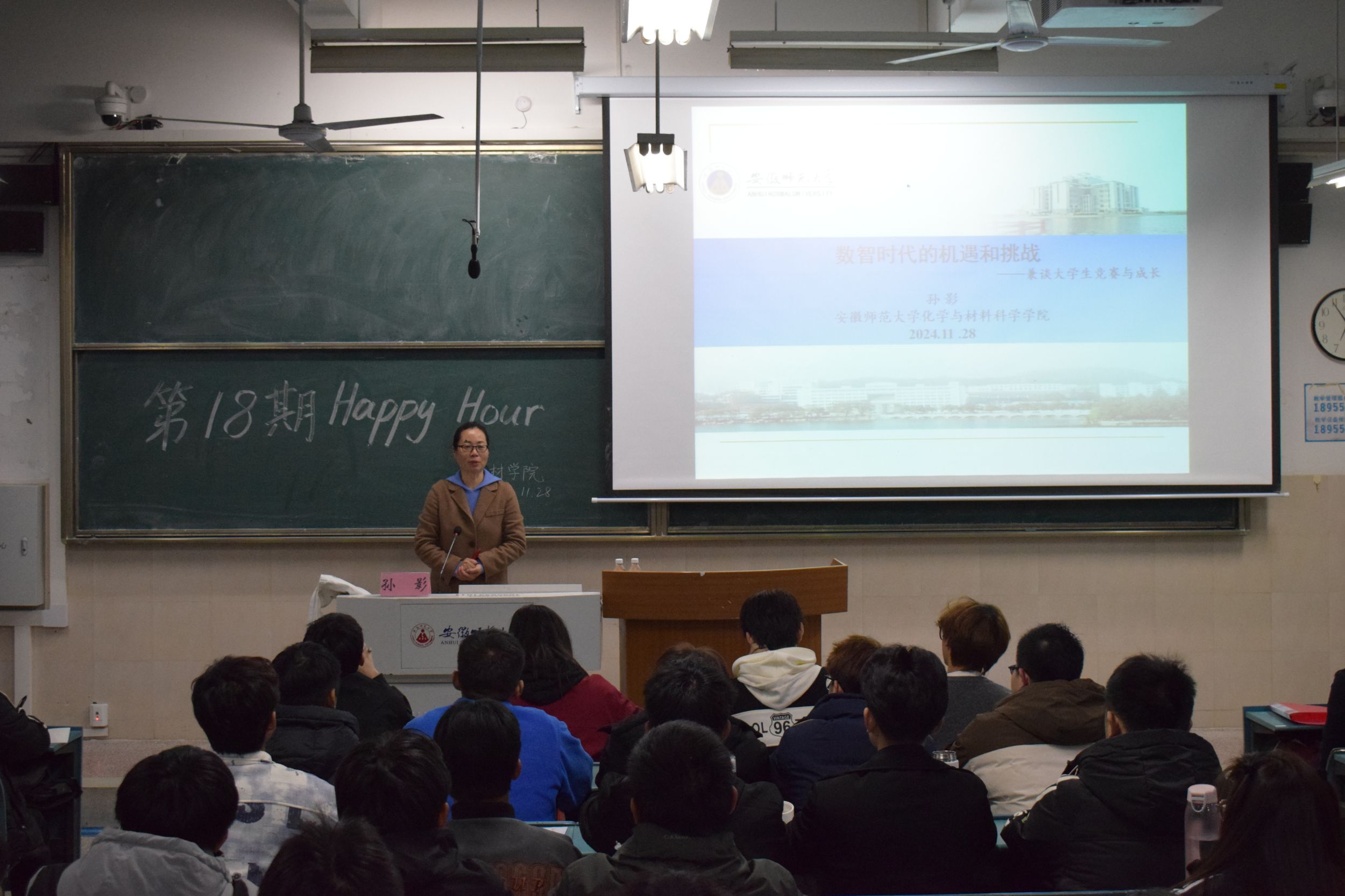 团委在行知楼5号楼101教室成功举办了第18期“Happy Hour”活动。此次活动以“协同创新,智启新篇—谈大学生竞赛与成长”为主题,特别邀请了学院孙影教授为2023级和2024级的同学们带来了主题为“数智时代的机遇和挑战”的精彩讲座。