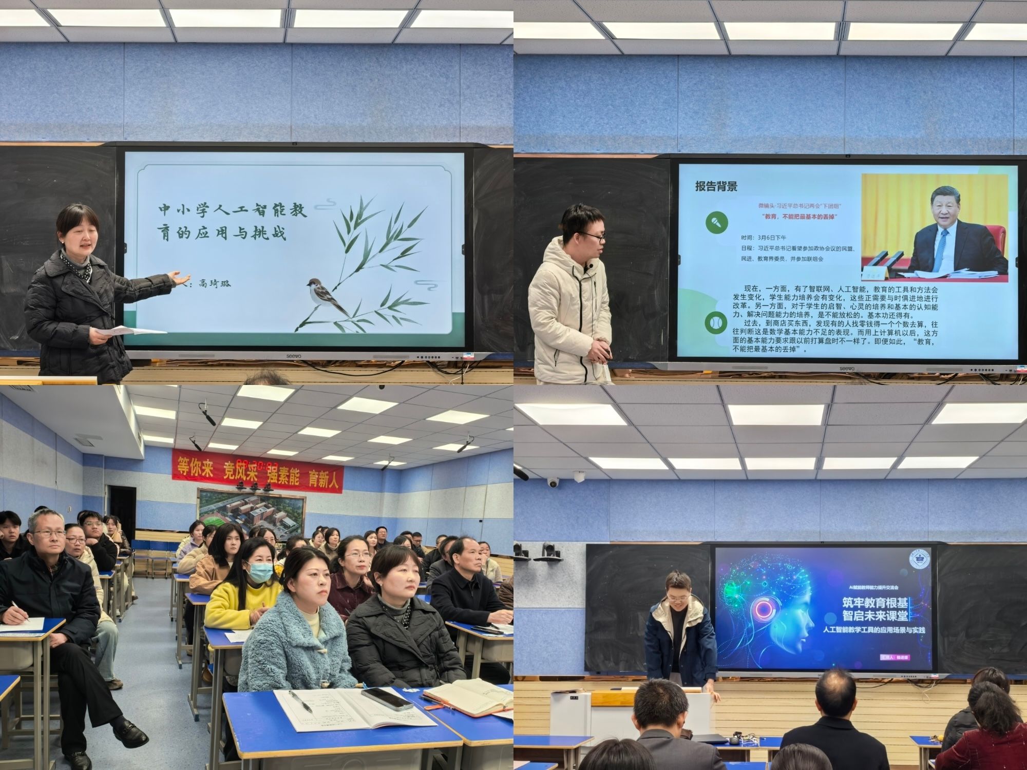 2. 阶段性成果汇报:4月7日下午开展AI教学实践交流会,实习生分享将智能工具融入课堂设计、习题命制与学生互动的经验,共五位实习生同学进行成果展示。