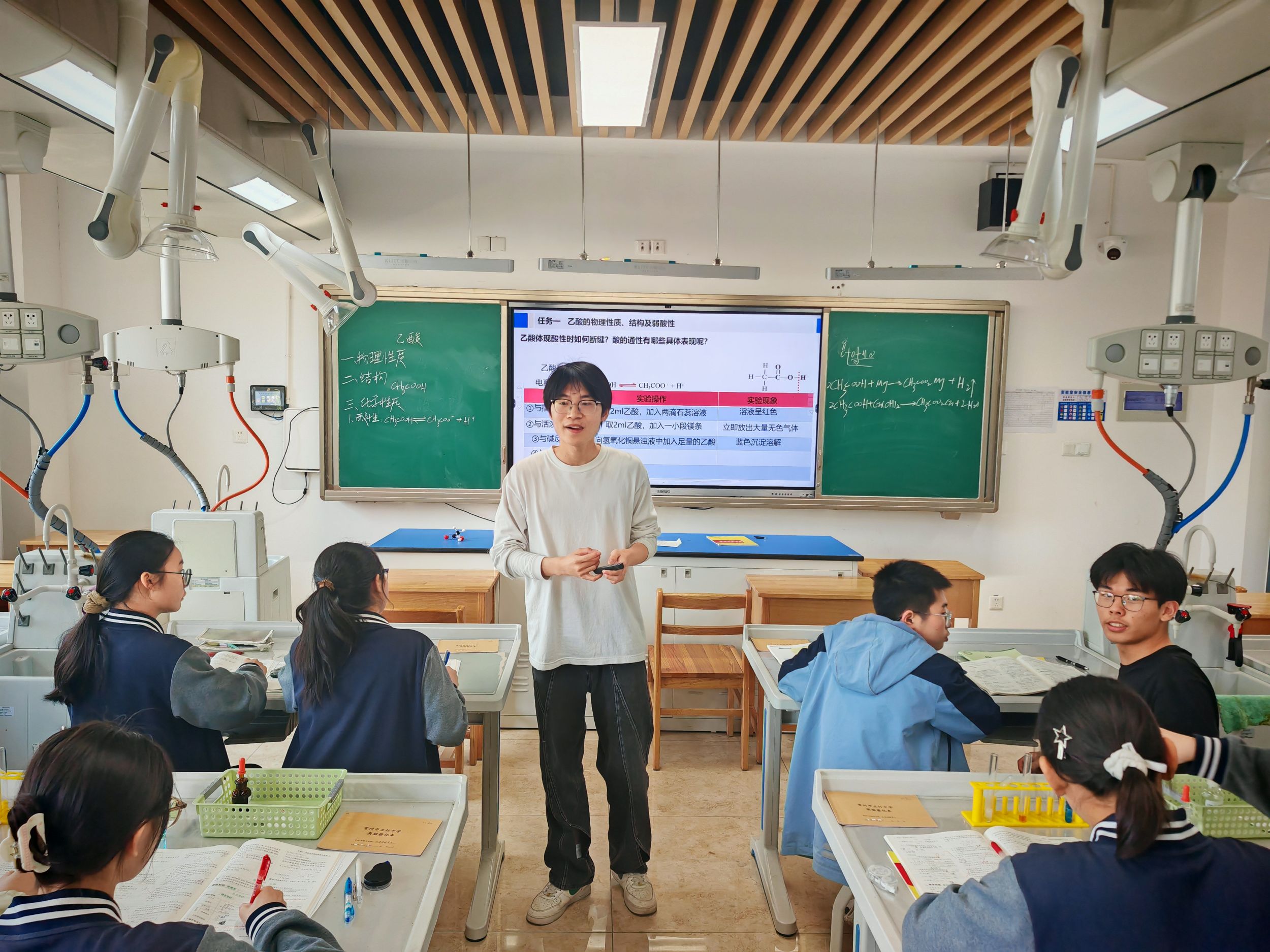 在常州市正行中学,学院调研组首先与正行中学校长高东梅、副校长蒋建兵、胡爱彬、党政办公室副主任黄刚及全体实习生展开座谈。实习生分别汇报了个人教学实践、班级管理、教研活动的收获,坦言“从学生到教师的角色转换充满挑战,但导师的悉心指导让自己快速成长”。崔鹏副院长勉励实习生:要珍惜一线教学机会,主动参与集体备课、教学研讨,在反思中提升课堂驾驭能力。随后,走进实习生课堂,观摩了2022级化学(师范)专业本科生张朕翔的公开课。张朕翔通过生活实例导入课程,借助多媒体动画演示反应机理,引导学生分组实验探究影响因素,课堂设计逻辑清晰、互动活跃。