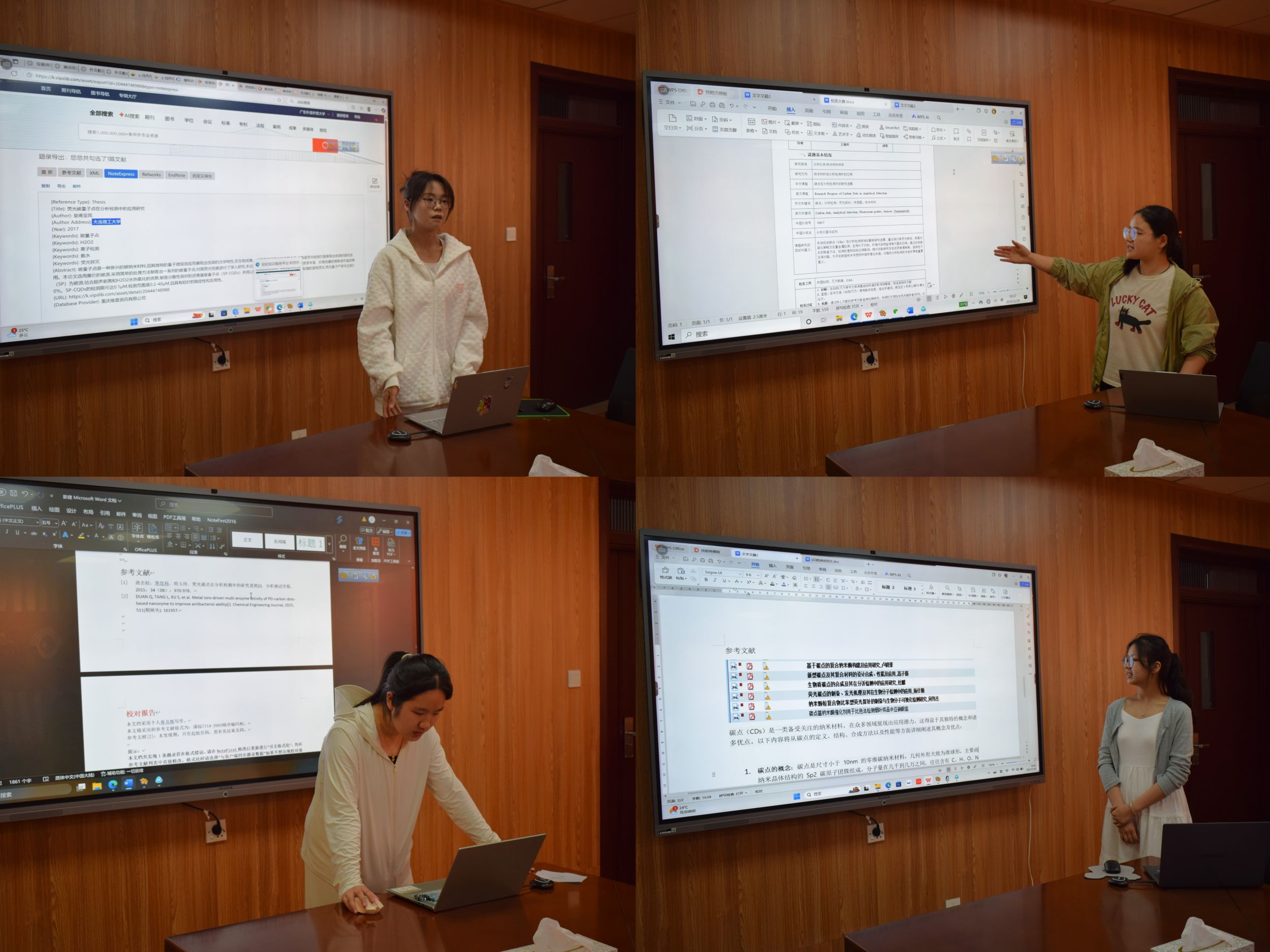 本次大赛通过初赛、预赛,最终共有九位选手进入决赛。决赛以“碳点在分析检测中的研究进展”为主题,给予各位选手50分钟时间通过电脑进行文献检索,文献管理和文献利用。在进行充分的准备以后,选手们依次上台进行汇报以及成果展示,参赛选手结合所给题目,从检索方式,检索过程,检索工具和检索结果展开汇报,形象具体地展示了文献的引用方法。在每位选手汇报结束以后,评委根据他们的汇报结果进行提问,并且指出了不足之处和改进建议。