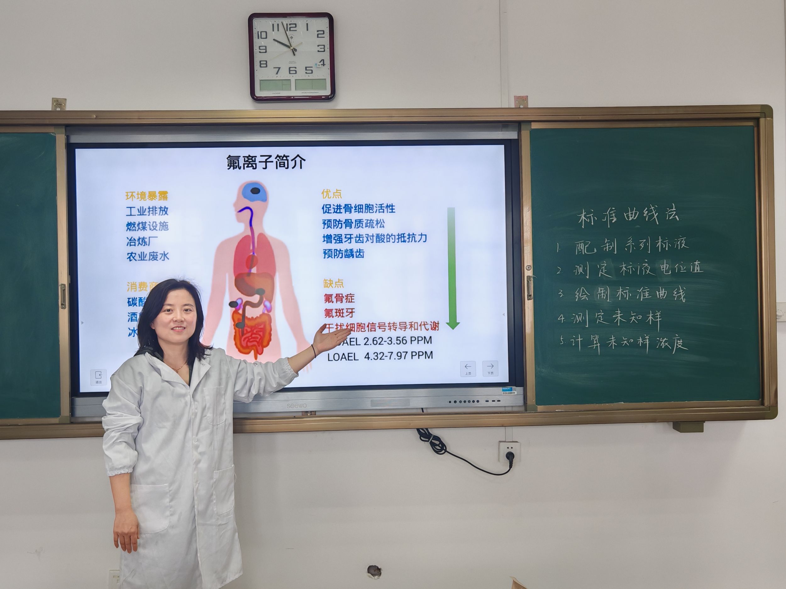 此外,在授课过程中,王广凤老师还强调了在日常生活中氟离子检测的重要意义,指出人体接触的氟离子浓度应严格控制在一定范围,氟离子浓度过高容易引发氟斑牙、氟骨症等病症,过低则会导致骨质疏松、龋齿等。王广凤老师也由此引出了本次实验中对于牙膏样品中氟离子含量测定的重要意义,由科学知识过渡到生活实际,让这堂公开课成为了大家感受化学魅力的平台,也为学生们今后的学习与成长描绘了新的蓝图。