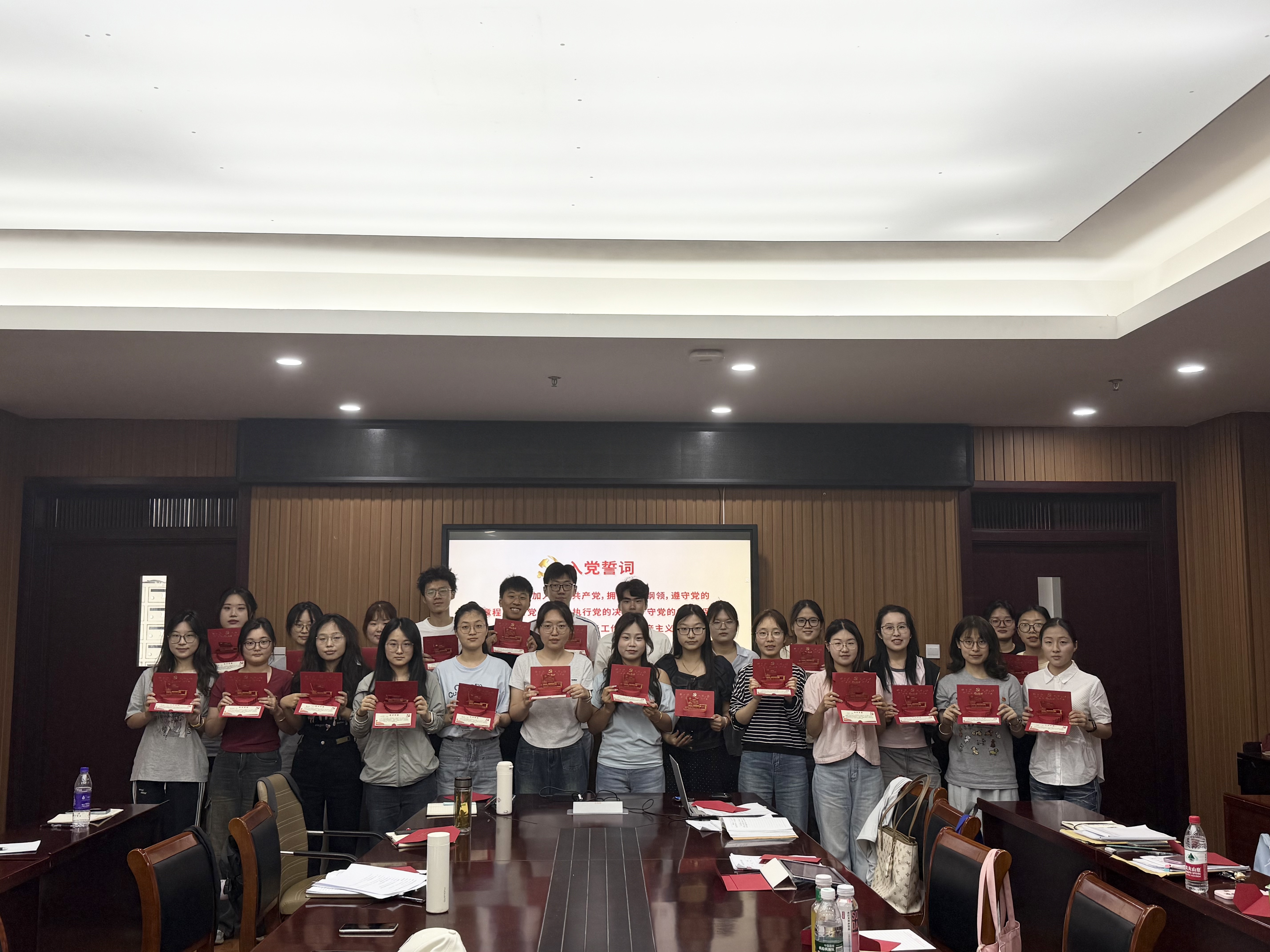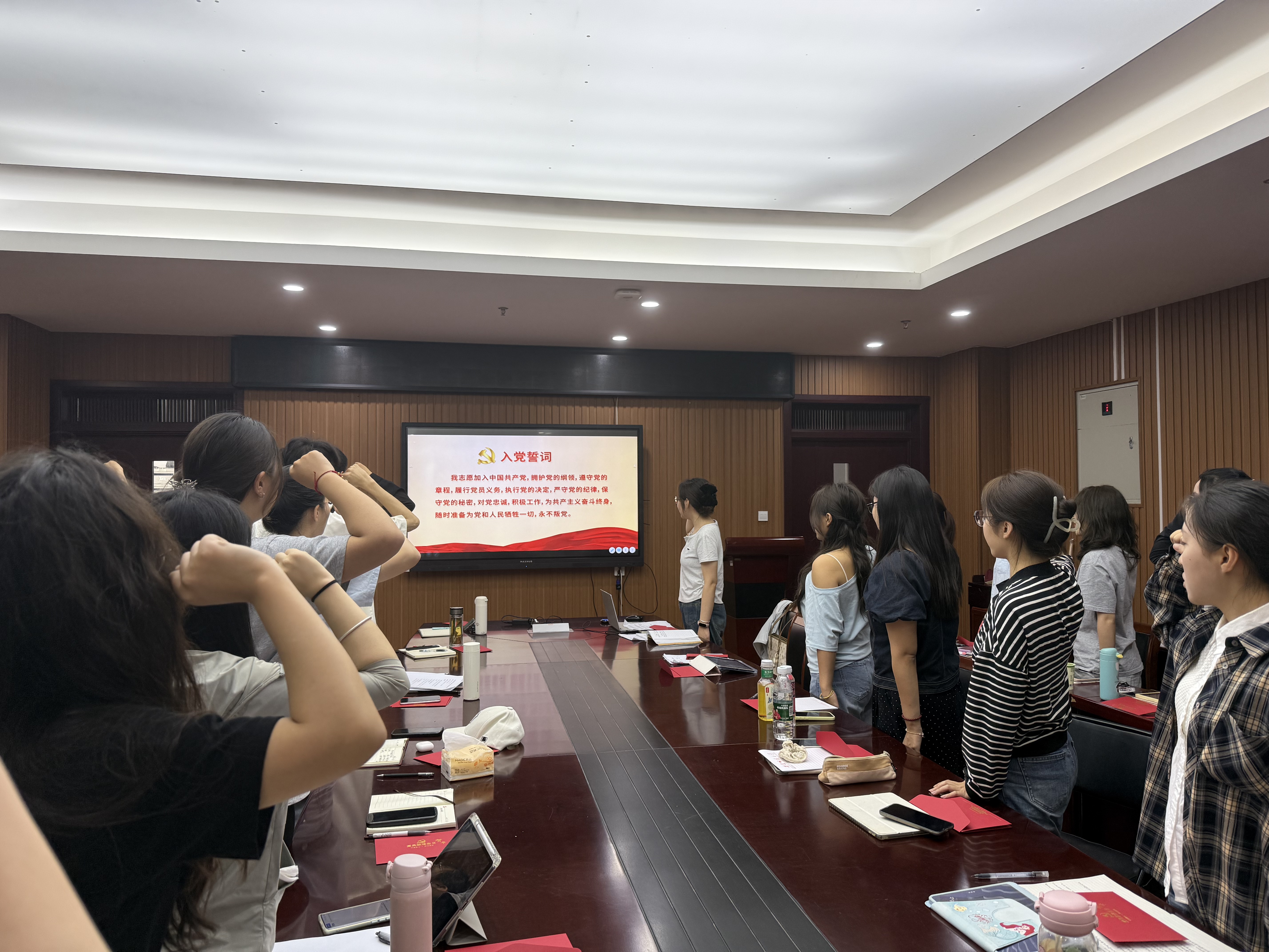 会议第二项议程,重温入党誓词,赠送政治生日贺卡。在支部书记的带领下,全体毕业生党员面向党旗郑重宣誓,重温入党初心。宣誓结束后,陶勇向毕业生党员赠送了政治生日贺卡,送上毕业祝福,希望全体毕业班党员能牢记共产党员的责任和使命,永葆共产党员的政治本色。