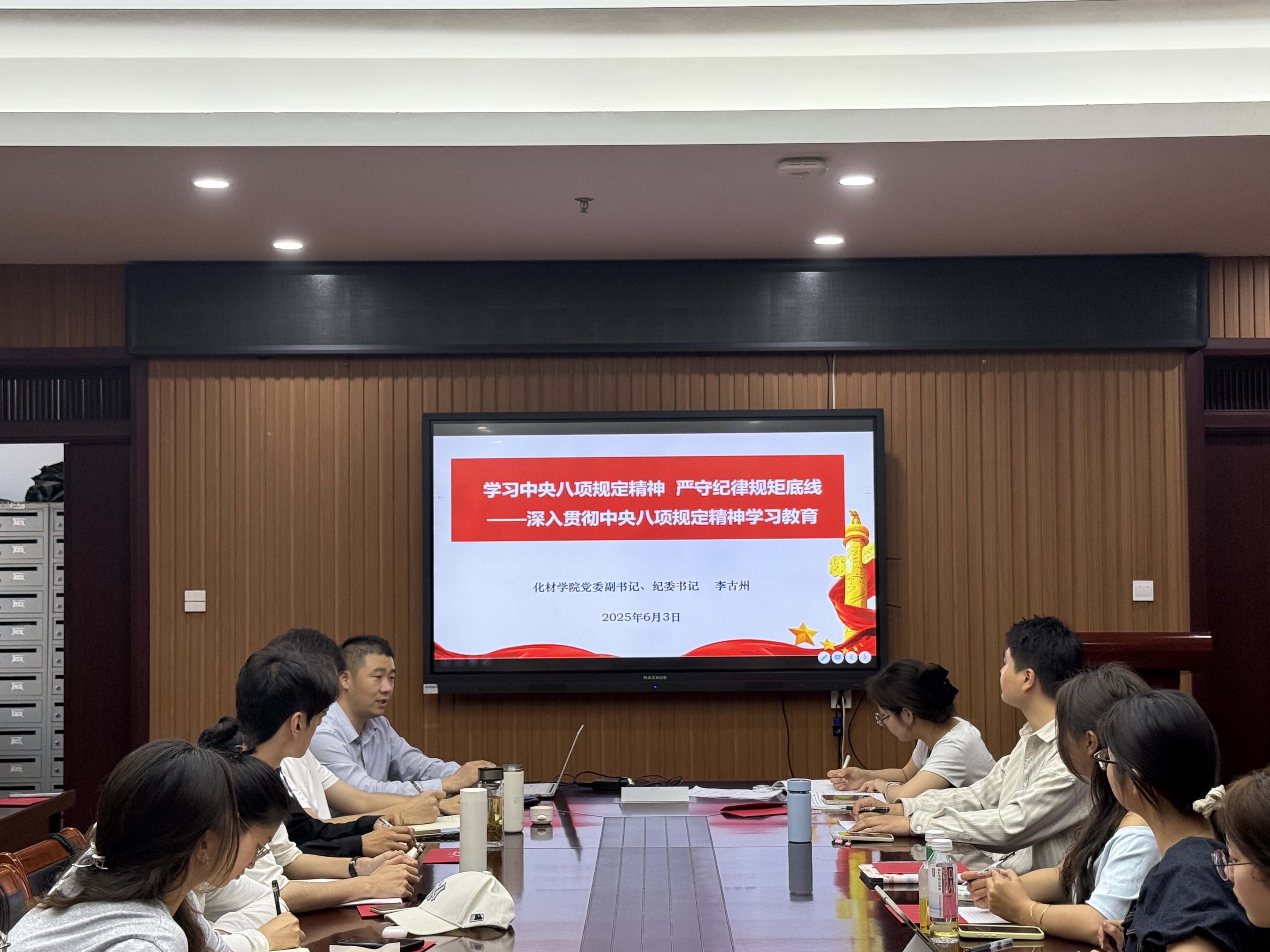 会议第一项议程,深入贯彻中央八项规定精神学习教育。李古州以《学习中央八项规定精神 严守纪律规矩底线》为主题为党支部全体党员讲授专题党课,从“为什么”“学什么”“有什么”“怎么罚”“如何做”五个角度详细阐述中央八项规定及其实施细则出台的历史背景与重大意义、主要内容、具体规定、违规处理和严守规矩底线重点内容,通过案例剖析,引导支部党员深刻领会中央八项规定精神的内涵与重要意义,切实增强廉洁自律的自觉性和坚定性。李古州强调,全体党员要压实工作责任、践行初心使命,要明晰学习内容、严守纪律规矩,要强化担当作为、强化服务意识。
