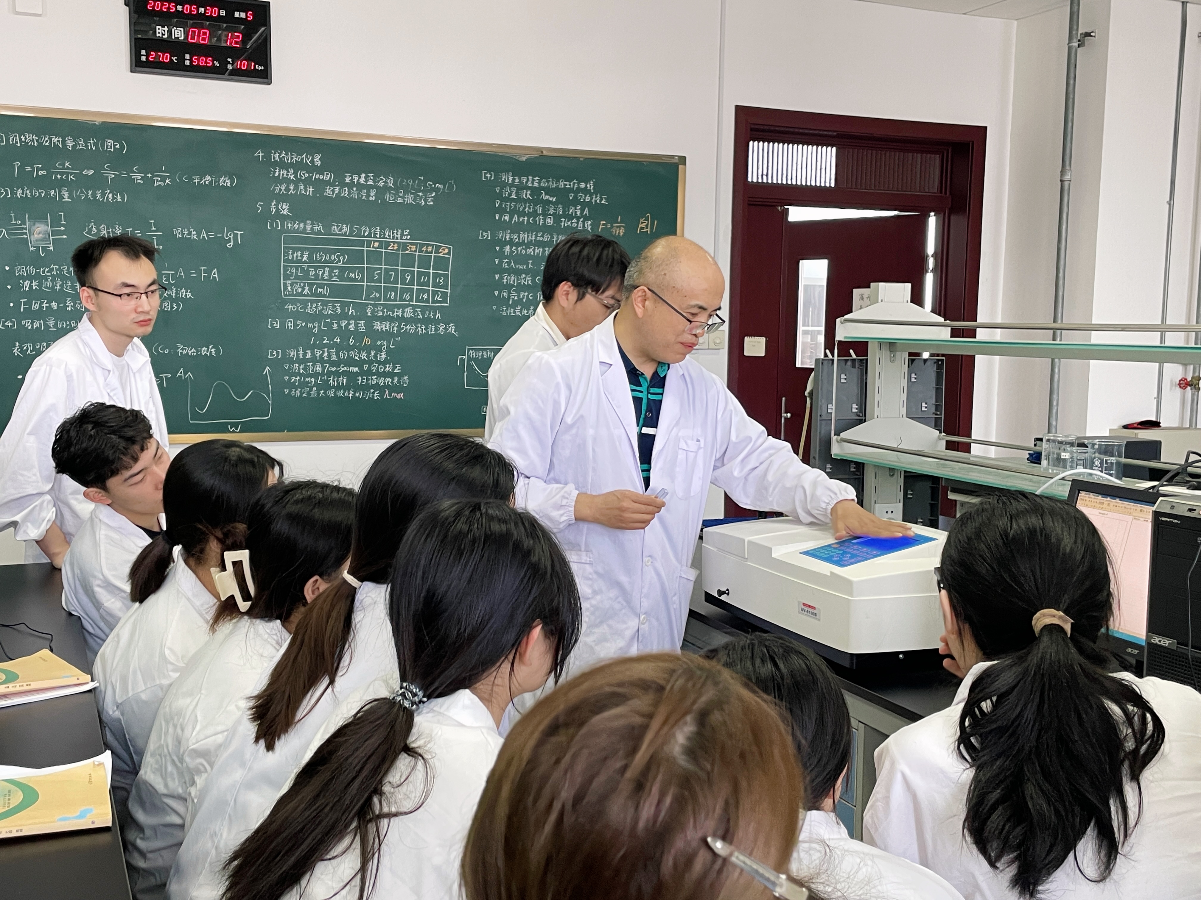 刘金水老师于礼勤楼533实验室,为2022级化学师范专业学生开展“溶液吸附法测量活性炭的比表面积”实验公开课,学院督导组以及部分教师参与观摩。