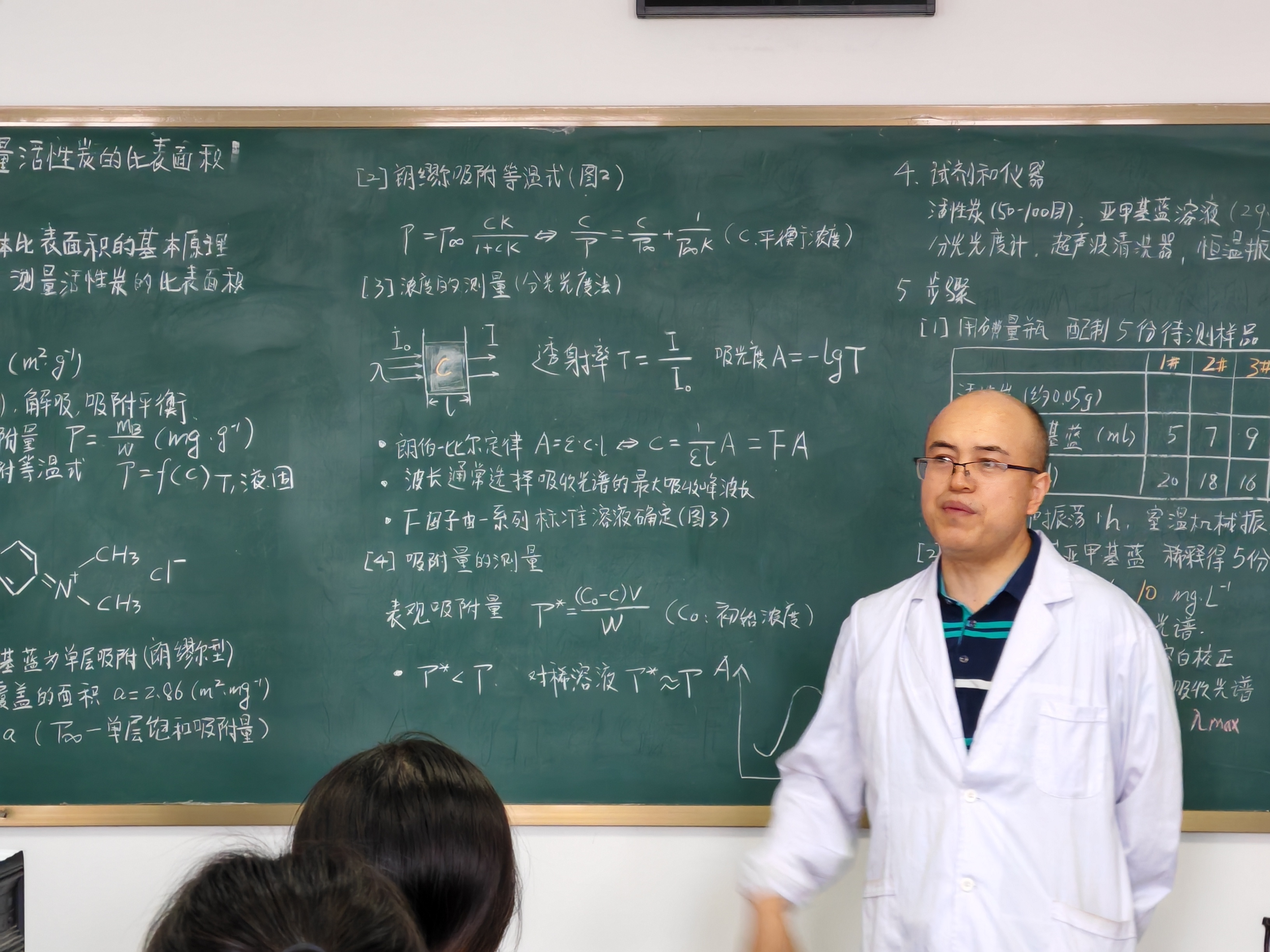 课堂伊始,刘金水老师以活性炭在水处理、空气净化等领域的实际应用为切入点,系统讲解了比表面积测量的理论基础。他巧妙利用生活中的“衣物染色”现象,结合吸附热力学与朗缪尔吸附等温线模型,详细阐释了亚甲基蓝溶液吸附法的原理——通过测定活性炭对亚甲基蓝的吸附量,计算其比表面积参数。为帮助学生理解,刘老师特别对比了气体吸附法与溶液吸附法的技术差异,强调实验中溶液浓度控制、吸附平衡时间等关键要点。