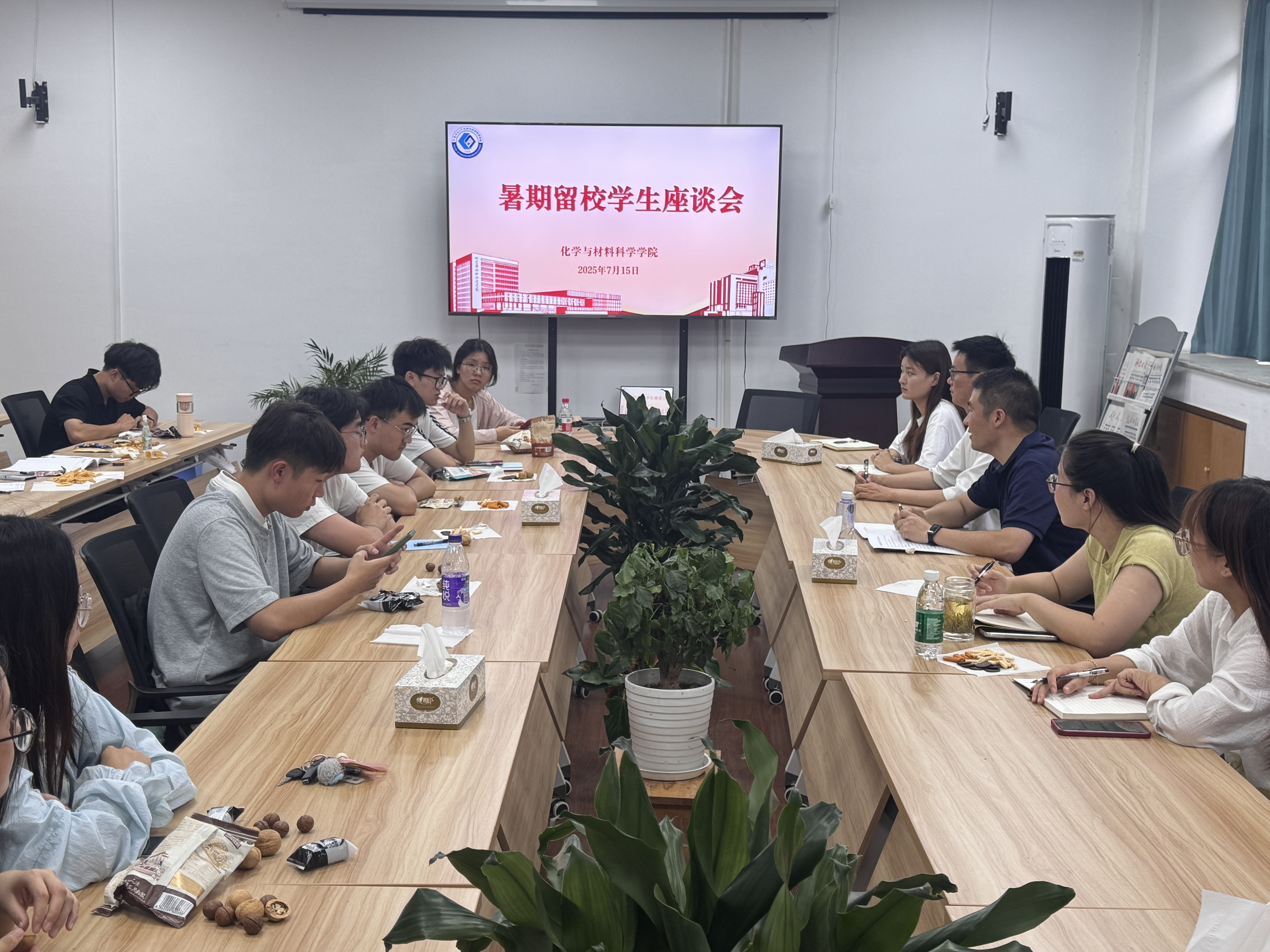 在学苑北楼9号楼205会议室召开2025年暑期留校学生交流座谈会。学院党委副书记李古州、辅导员及参与小学期、暑期社会实践、考研备考的20余名留校学生代表参会。