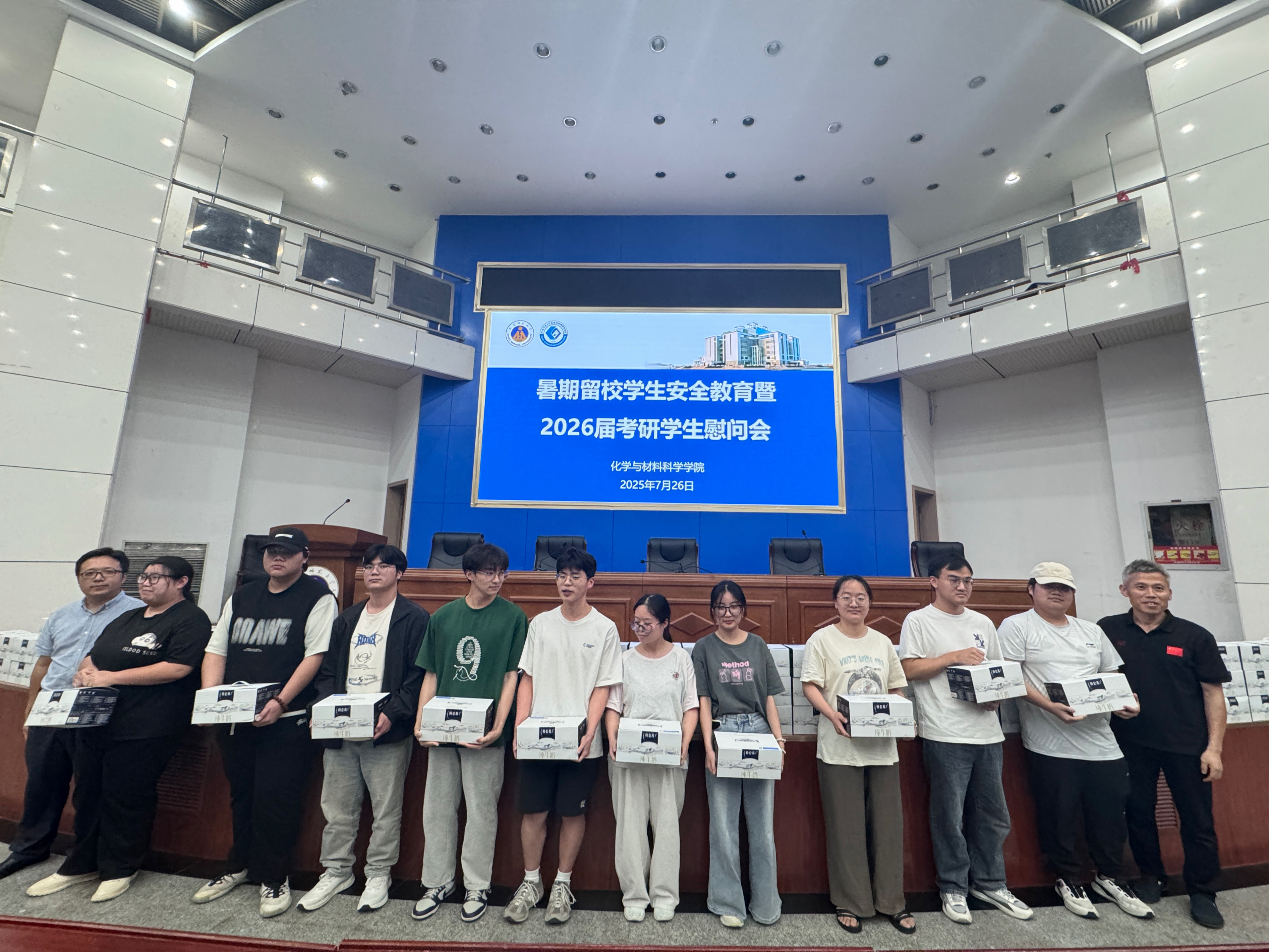 在敬文图书馆报告厅举行了暑期留校学生安全教育暨2026届考研慰问会,院党委书记梁齐军、院长庄桂林、辅导员陈静、朱文棋、朱梦茹、李汝共同出席了慰问活动,为暑期备战考研留校学生送去了温暖与关怀。会议由学院党委副书记李古州主持。