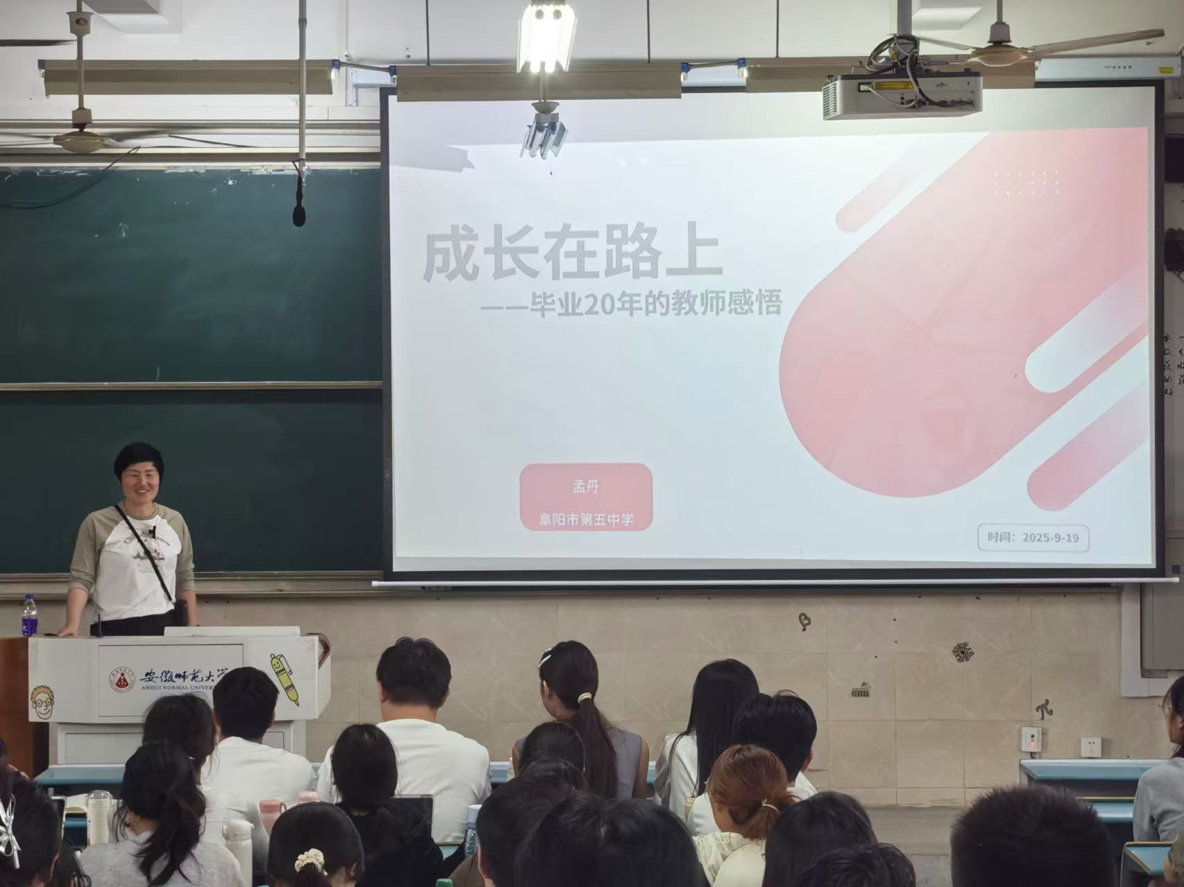 9 月 19 日下午,阜阳市第五中学高级教师孟丹老师在行知楼 2010303 教室,以《成长在路上 —— 毕业 20 年的教师感悟》为题,带来一场充满温度与深度的分享。
