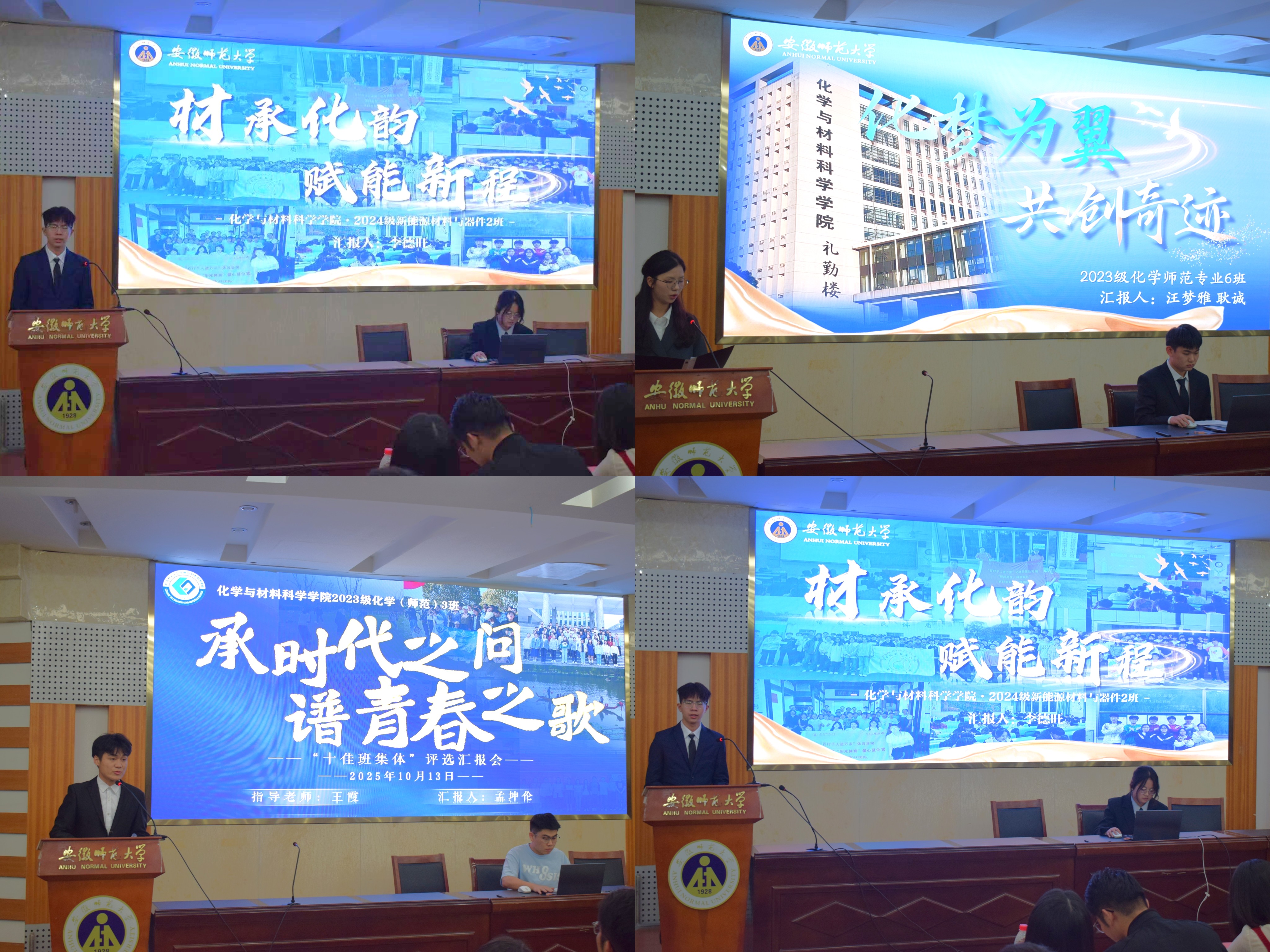 本次学院“十佳班集体”评选共有18个参评班级现场汇报。2024级化学(师范)5班、新能源材料与器件1班等,着重展示了他们从入学至今的快速融入与成长,通过一系列破冰活动、学习小组和主题团日,迅速凝聚起强大的班级向心力。2023级新能源材料与器件2班、应用化学2班的同学们分享了在实验室和项目竞赛中的探索与收获,体现了化材学子扎实的学术功底与创新意识。2022级化学(师范)2班、化学工程与工艺2班等班级,则系统梳理了过往三年的积累,并对未来的升学就业规划进行了展望,为学弟学妹们提供了宝贵的经验。各班级的演讲十分精彩,每一段文字、每一张图片,体现化材学子对于良好班风建设追求。