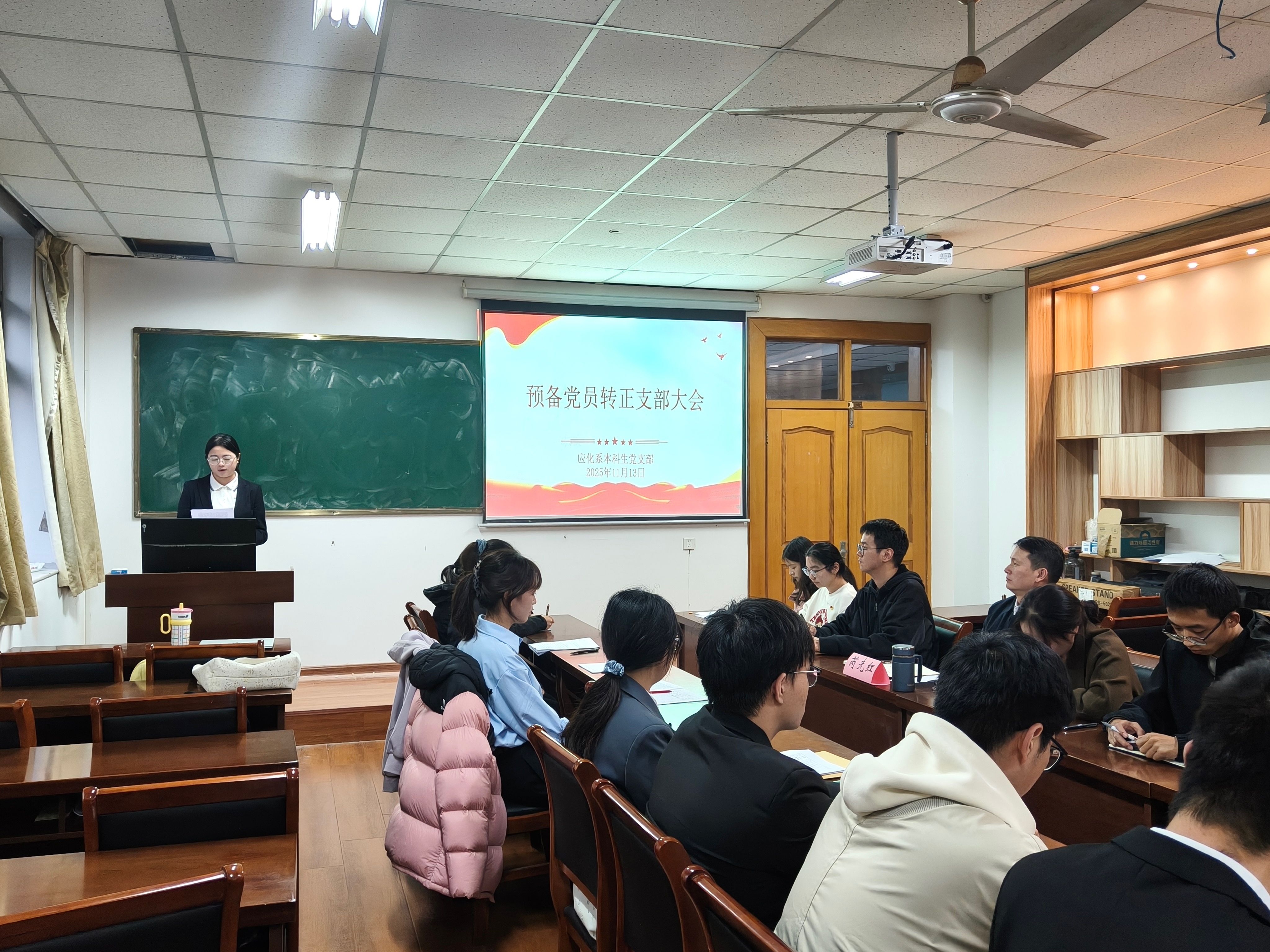 2025年11月13日下午,应化系本科生党支部于学苑6号楼114会议室召开了党的二十届四中全会精神专题学习会暨党员发展支部大会,学院党委副书记、纪委书记芮先红列席指导,会议由支部书记梁成主持。