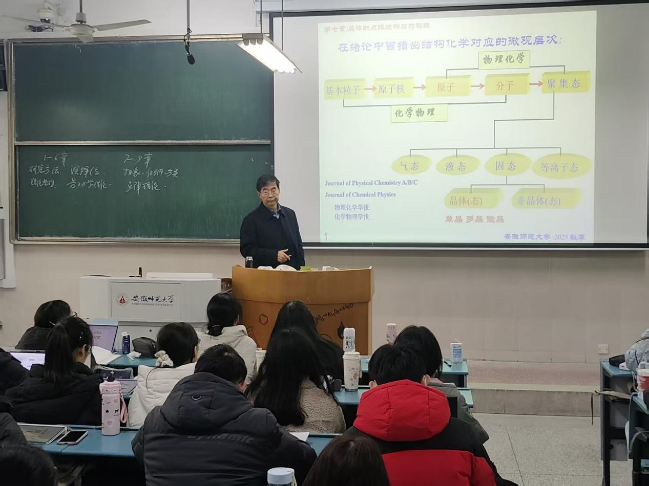 王文亮老师在花津校区行知楼3号楼2030103教室为2023级化学(师范)专业1、2、7班全体同学讲授了一场精彩的结构化学示范课。学院教学副院长、教学督导组、部分专业教师前来观摩听课。