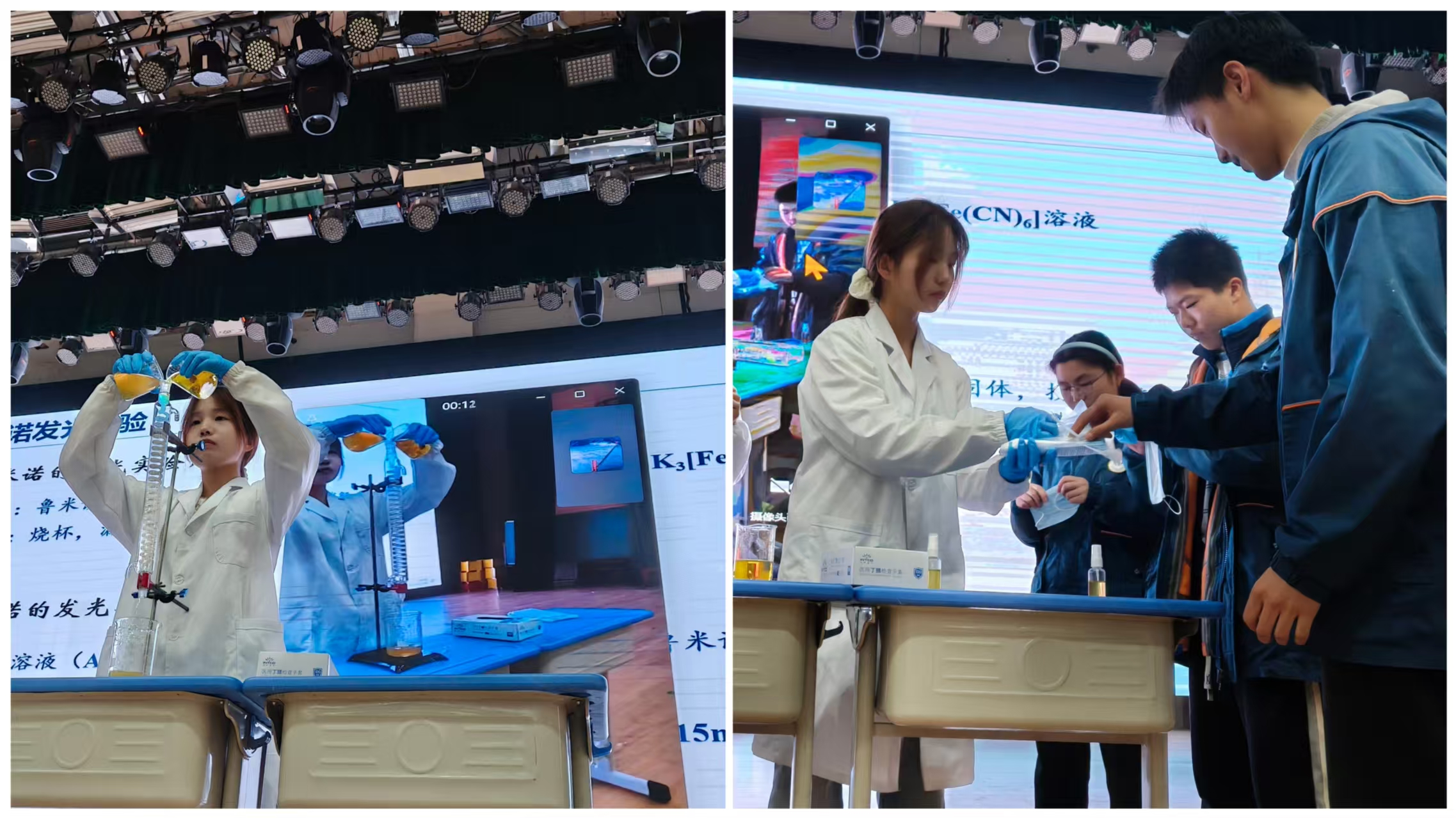 “鲁米诺化学发光实验”将现场氛围推向高潮。现场灯光关闭,营造出暗环境。志愿者将鲁米诺碱性溶液,与氧化-催化混合液快速混合,在这一瞬间,蓝色荧光骤然绽放,如同深邃夜空中的星光闪烁,柔和而梦幻,引得学生们阵阵惊叹。当荧光逐渐减弱后,志愿者补充加入过氧化氢溶液,蓝色荧光再次亮起,“复亮”现象让学生们深刻体会到反应的可逆性与能量转化的奥秘。