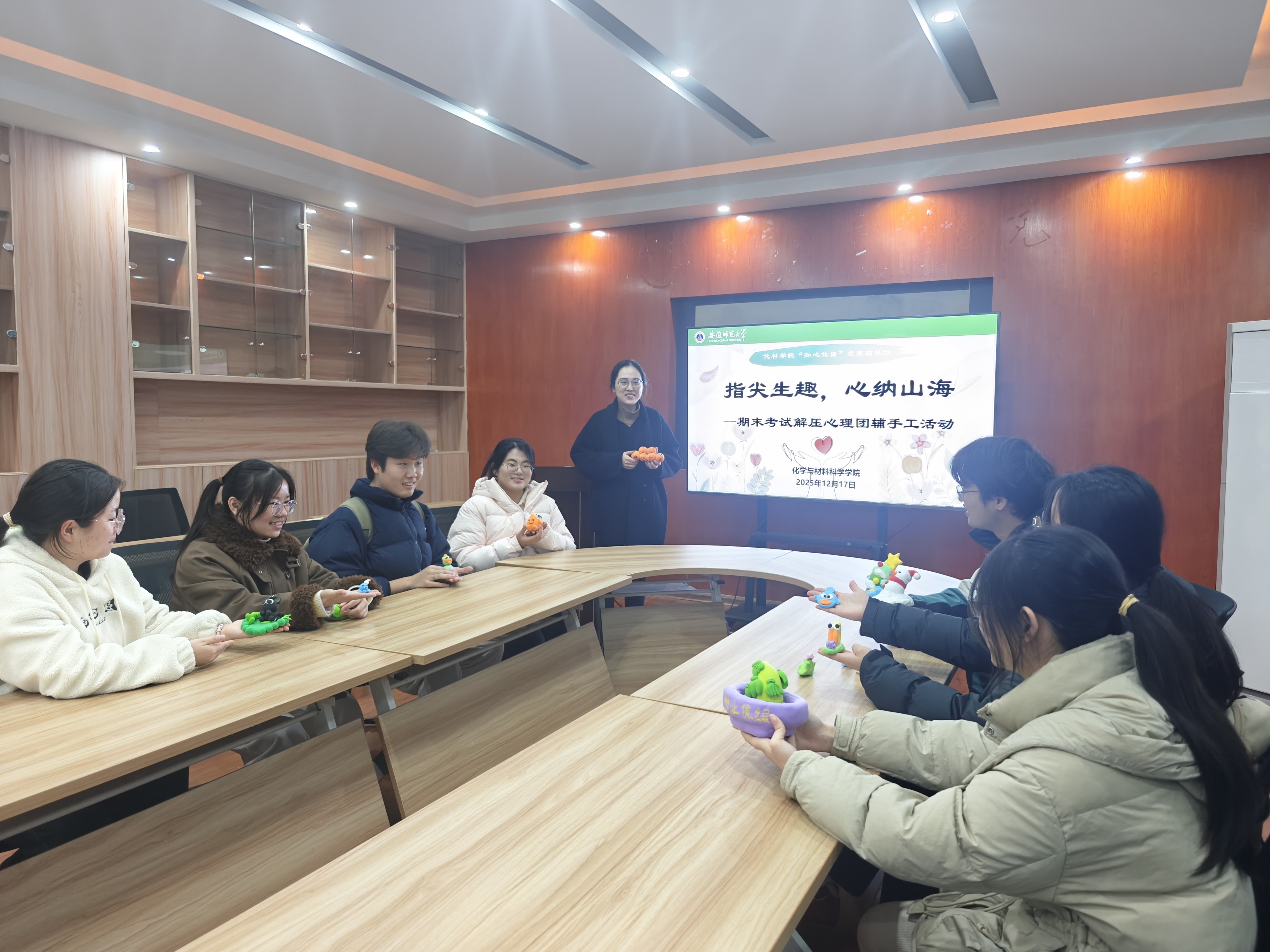 “知心化语”大学生发展辅导站举办了“指尖生趣·心纳山海”期末心理解压活动。通过手工泥制作这一沉浸式体验,同学们在方寸泥团中释放情绪、舒缓身心。现场准备了色彩丰富的环保黏土与塑形工具,温馨布置营造出轻松愉快的氛围。
