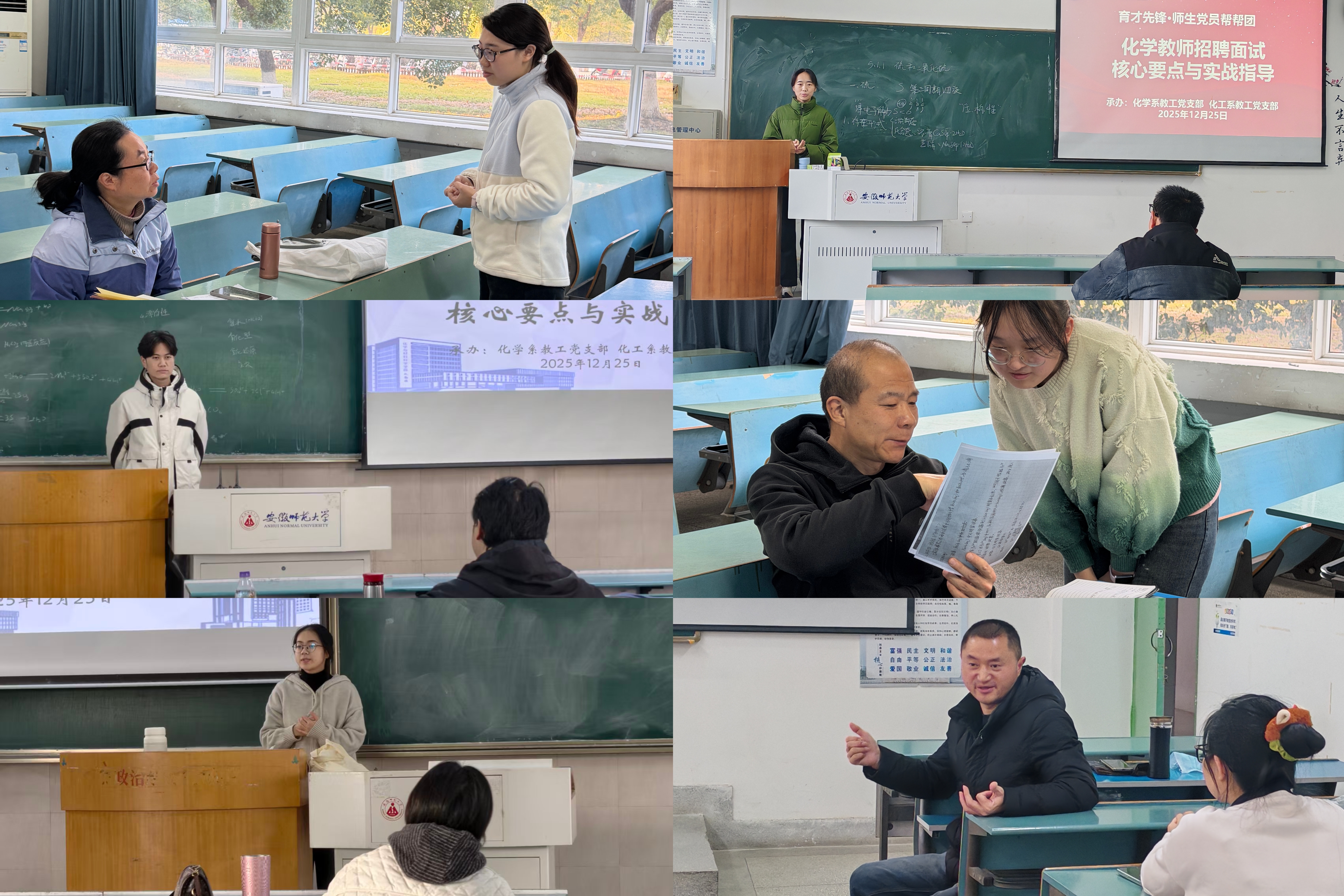 模拟实战分层演练,淬炼教学真本领。12月25日,活动转移至教学楼进入“模拟面试”阶段。化学系教工党支部、化工系教工党支部的“帮帮团”党员教师化身“模拟考官”与“协作同伴”,从教学内容设计、教姿教态、语言表达、板书布局、多媒体及实验教具使用(包括安全规范)等各方面进行细致观察与记录,提出了中肯的改进建议。这种沉浸式的互动,让在场同学直观地认识到自身的优势与不足,对面试流程和细节要求有了更深刻的体会。